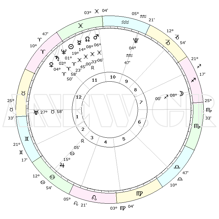 | | ΘΕΣΕΙΣ ΠΛΑΝΗΤΩΝ ΑΣΤΡΟΛΟΓΙΚΟΥ ΧΑΡΤΗ ΤΗΣ ΣΤΙΓΜΗΣ ΑΥΤΗΣ | | | | Πλανήτης | Ζώδιο | Μοίρες | Δεκαήμ. | Σε οίκο | Απόκλιση | | Ακμές των οίκων | | Ηλιος | Ιχθείς | 19°42' | Δεύτερο | 12 | 04 S 05 | | 1ος | 27°43' | Κριός | | Σελήνη | Τοξότης | 07°20' | Πρώτο | 8 | 26 S 44 | | 2ος | 00°34' | Δίδυμοι | | Ερμής | Ιχθείς | 14°04'R | Δεύτερο | 12 | 03 S 11 | | 3ος | 24°22' | Δίδυμοι | | Αφροδίτη | Κριός | 04°45' | Πρώτο | 12 | 00 N 49 | | 4ος | 16°03' | Καρκίνος | | Αρης | Ιχθείς | 06°03' | Πρώτο | 11 | 10 S 18 | | 5ος | 10°14' | Λέων | | Δίας | Καρκίνος | 15°05'R | Δεύτερο | 3 | 22 N 56 | | 6ος | 12°30' | Παρθένος | | Κρόνος | Κριός | 02°58' | Πρώτο | 12 | 00 S 47 | | 7ος | 27°43' | Ζυγός | | Ουρανός | Ταύρος | 27°58' | Τρίτο | 1 | 19 N 32 | | 8ος | 00°34' | Τοξότης | | Ποσειδώνας | Κριός | 01°23' | Πρώτο | 12 | 00 S 39 | | 9ος | 24°22' | Τοξότης | | Πλούτωνας | Υδροχόος | 04°46' | Πρώτο | 10 | 22 S 50 | | 10ος | 16°03' | Αιγόκερως | | Β. Δεσμός | Ιχθείς | 08°33' | Πρώτο | 11 | 08 S 22 | | 11ος | 10°14' | Υδροχόος | | Ωροσκόπος | Κριός | 27°43' | Τρίτο | | | 12ος | 12°30' | Ιχθείς | | Μεσουράνημα | Αιγόκερως | 16°03' | Δεύτερο | | | |