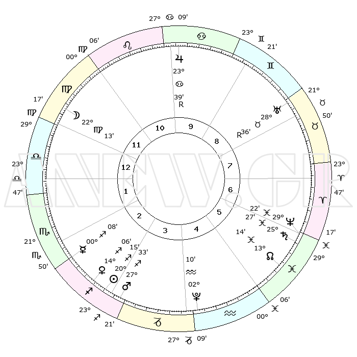 | | ΘΕΣΕΙΣ ΠΛΑΝΗΤΩΝ ΑΣΤΡΟΛΟΓΙΚΟΥ ΧΑΡΤΗ ΤΗΣ ΣΤΙΓΜΗΣ ΑΥΤΗΣ | | | | Πλανήτης | Ζώδιο | Μοίρες | Δεκαήμ. | Σε οίκο | Απόκλιση | | Ακμές των οίκων | | Ηλιος | Τοξότης | 19°13' | Δεύτερο | 2 | 23 S 00 | | 1ος | 20°45' | Ζυγός | | Σελήνη | Παρθένος | 09°28' | Πρώτο | 11 | 08 N 19 | | 2ος | 18°38' | Σκορπιός | | Ερμής | Σκορπιός | 28°54' | Τρίτο | 2 | 17 S 57 | | 3ος | 19°58' | Τοξότης | | Αφροδίτη | Τοξότης | 12°50' | Δεύτερο | 2 | 22 S 01 | | 4ος | 23°36' | Αιγόκερως | | Αρης | Τοξότης | 26°47' | Τρίτο | 3 | 24 S 08 | | 5ος | 26°33' | Υδροχόος | | Δίας | Καρκίνος | 23°45'R | Τρίτο | 10 | 21 N 32 | | 6ος | 25°57' | Ιχθείς | | Κρόνος | Ιχθείς | 25°26' | Τρίτο | 5 | 03 S 57 | | 7ος | 20°45' | Κριός | | Ουρανός | Ταύρος | 28°39'R | Τρίτο | 8 | 19 N 39 | | 8ος | 18°38' | Ταύρος | | Ποσειδώνας | Ιχθείς | 29°22' | Τρίτο | 6 | 01 S 29 | | 9ος | 19°58' | Δίδυμοι | | Πλούτωνας | Υδροχόος | 02°08' | Πρώτο | 4 | 23 S 21 | | 10ος | 23°36' | Καρκίνος | | Β. Δεσμός | Ιχθείς | 13°17' | Δεύτερο | 5 | 06 S 34 | | 11ος | 26°33' | Λέων | | Ωροσκόπος | Ζυγός | 20°45' | Τρίτο | | | 12ος | 25°57' | Παρθένος | | Μεσουράνημα | Καρκίνος | 23°36' | Τρίτο | | | |