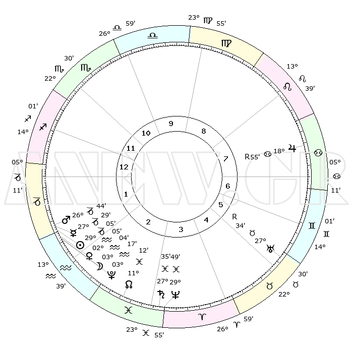 | | ΘΕΣΕΙΣ ΠΛΑΝΗΤΩΝ ΑΣΤΡΟΛΟΓΙΚΟΥ ΧΑΡΤΗ ΤΗΣ ΣΤΙΓΜΗΣ ΑΥΤΗΣ | | | | Πλανήτης | Ζώδιο | Μοίρες | Δεκαήμ. | Σε οίκο | Απόκλιση | | Ακμές των οίκων | | Ηλιος | Αιγόκερως | 28°53' | Τρίτο | 3 | 20 S 23 | | 1ος | 04°11' | Σκορπιός | | Σελήνη | Υδροχόος | 00°32' | Πρώτο | 3 | 23 S 12 | | 2ος | 02°51' | Τοξότης | | Ερμής | Αιγόκερως | 27°09' | Τρίτο | 3 | 22 S 40 | | 3ος | 05°10' | Αιγόκερως | | Αφροδίτη | Υδροχόος | 01°49' | Πρώτο | 3 | 20 S 49 | | 4ος | 09°39' | Υδροχόος | | Αρης | Αιγόκερως | 26°34' | Τρίτο | 3 | 21 S 48 | | 5ος | 12°30' | Ιχθείς | | Δίας | Καρκίνος | 18°57'R | Δεύτερο | 9 | 22 N 22 | | 6ος | 10°46' | Κριός | | Κρόνος | Ιχθείς | 27°34' | Τρίτο | 5 | 02 S 59 | | 7ος | 04°11' | Ταύρος | | Ουρανός | Ταύρος | 27°34'R | Τρίτο | 7 | 19 N 25 | | 8ος | 02°51' | Δίδυμοι | | Ποσειδώνας | Ιχθείς | 29°49' | Τρίτο | 5 | 01 S 17 | | 9ος | 05°10' | Καρκίνος | | Πλούτωνας | Υδροχόος | 03°17' | Πρώτο | 3 | 23 S 06 | | 10ος | 09°39' | Λέων | | Β. Δεσμός | Ιχθείς | 11°13' | Δεύτερο | 4 | 07 S 21 | | 11ος | 12°30' | Παρθένος | | Ωροσκόπος | Σκορπιός | 04°11' | Πρώτο | | | 12ος | 10°46' | Ζυγός | | Μεσουράνημα | Λέων | 09°39' | Πρώτο | | | |