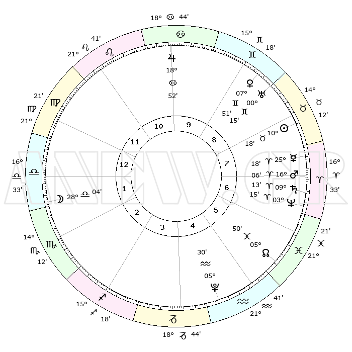 | | ΘΕΣΕΙΣ ΠΛΑΝΗΤΩΝ ΑΣΤΡΟΛΟΓΙΚΟΥ ΧΑΡΤΗ ΤΗΣ ΣΤΙΓΜΗΣ ΑΥΤΗΣ | | | | Πλανήτης | Ζώδιο | Μοίρες | Δεκαήμ. | Σε οίκο | Απόκλιση | | Ακμές των οίκων | | Ηλιος | Ταύρος | 10°14' | Δεύτερο | 8 | 14 N 53 | | 1ος | 29°59' | Παρθένος | | Σελήνη | Ζυγός | 27°22' | Τρίτο | 2 | 14 S 10 | | 2ος | 26°34' | Ζυγός | | Ερμής | Κριός | 25°12' | Τρίτο | 7 | 07 N 55 | | 3ος | 27°00' | Σκορπιός | | Αφροδίτη | Δίδυμοι | 07°47' | Πρώτο | 9 | 22 N 28 | | 4ος | 29°59' | Τοξότης | | Αρης | Κριός | 16°03' | Δεύτερο | 7 | 05 N 30 | | 5ος | 02°58' | Υδροχόος | | Δίας | Καρκίνος | 18°52' | Δεύτερο | 10 | 22 N 30 | | 6ος | 03°24' | Ιχθείς | | Κρόνος | Κριός | 09°13' | Πρώτο | 7 | 01 N 39 | | 7ος | 29°59' | Ιχθείς | | Ουρανός | Δίδυμοι | 00°15' | Πρώτο | 9 | 20 N 02 | | 8ος | 26°34' | Κριός | | Ποσειδώνας | Κριός | 03°15' | Πρώτο | 7 | 00 N 05 | | 9ος | 27°00' | Ταύρος | | Πλούτωνας | Υδροχόος | 05°30' | Πρώτο | 5 | 22 S 49 | | 10ος | 29°59' | Δίδυμοι | | Β. Δεσμός | Ιχθείς | 05°50' | Πρώτο | 6 | 09 S 22 | | 11ος | 02°58' | Λέων | | Ωροσκόπος | Παρθένος | 29°59' | Τρίτο | | | 12ος | 03°24' | Παρθένος | | Μεσουράνημα | Δίδυμοι | 29°59' | Τρίτο | | | |