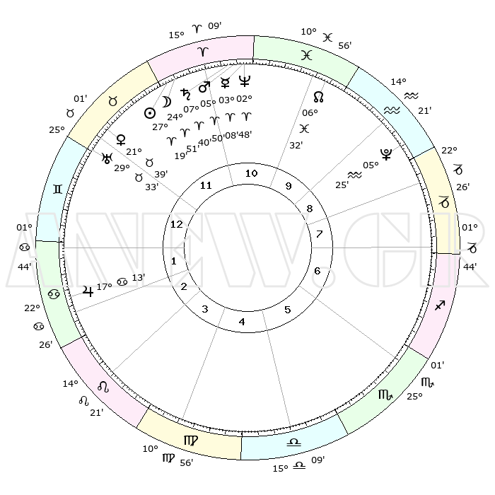 | | ΘΕΣΕΙΣ ΠΛΑΝΗΤΩΝ ΑΣΤΡΟΛΟΓΙΚΟΥ ΧΑΡΤΗ ΤΗΣ ΣΤΙΓΜΗΣ ΑΥΤΗΣ | | | | Πλανήτης | Ζώδιο | Μοίρες | Δεκαήμ. | Σε οίκο | Απόκλιση | | Ακμές των οίκων | | Ηλιος | Κριός | 27°16' | Τρίτο | 11 | 10 N 30 | | 1ος | 13°46' | Δίδυμοι | | Σελήνη | Κριός | 24°06' | Τρίτο | 11 | 12 N 47 | | 2ος | 06°12' | Καρκίνος | | Ερμής | Κριός | 03°04' | Πρώτο | 11 | 01 S 12 | | 3ος | 27°25' | Καρκίνος | | Αφροδίτη | Ταύρος | 21°36' | Τρίτο | 12 | 18 N 25 | | 4ος | 21°29' | Λέων | | Αρης | Κριός | 05°48' | Πρώτο | 11 | 01 N 25 | | 5ος | 22°29' | Παρθένος | | Δίας | Καρκίνος | 17°12' | Δεύτερο | 2 | 22 N 42 | | 6ος | 02°31' | Σκορπιός | | Κρόνος | Κριός | 07°39' | Πρώτο | 11 | 01 N 04 | | 7ος | 13°46' | Τοξότης | | Ουρανός | Ταύρος | 29°32' | Τρίτο | 12 | 19 N 53 | | 8ος | 06°12' | Αιγόκερως | | Ποσειδώνας | Κριός | 02°48' | Πρώτο | 11 | 00 S 05 | | 9ος | 27°25' | Αιγόκερως | | Πλούτωνας | Υδροχόος | 05°25' | Πρώτο | 9 | 22 S 47 | | 10ος | 21°29' | Υδροχόος | | Β. Δεσμός | Ιχθείς | 06°33' | Πρώτο | 10 | 09 S 06 | | 11ος | 22°29' | Ιχθείς | | Ωροσκόπος | Δίδυμοι | 13°46' | Δεύτερο | | | 12ος | 02°31' | Ταύρος | | Μεσουράνημα | Υδροχόος | 21°29' | Τρίτο | | | |