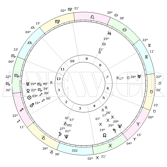 | | ΘΕΣΕΙΣ ΠΛΑΝΗΤΩΝ ΑΣΤΡΟΛΟΓΙΚΟΥ ΧΑΡΤΗ ΤΗΣ ΣΤΙΓΜΗΣ ΑΥΤΗΣ | | | | Πλανήτης | Ζώδιο | Μοίρες | Δεκαήμ. | Σε οίκο | Απόκλιση | | Ακμές των οίκων | | Ηλιος | Τοξότης | 03°04' | Πρώτο | 2 | 20 S 46 | | 1ος | 28°28' | Ζυγός | | Σελήνη | Αιγόκερως | 26°01' | Τρίτο | 3 | 24 S 38 | | 2ος | 26°48' | Σκορπιός | | Ερμής | Σκορπιός | 22°44'R | Τρίτο | 1 | 16 S 36 | | 3ος | 28°38' | Τοξότης | | Αφροδίτη | Σκορπιός | 22°48' | Τρίτο | 1 | 17 S 35 | | 4ος | 02°43' | Υδροχόος | | Αρης | Τοξότης | 14°57' | Δεύτερο | 2 | 23 S 12 | | 5ος | 05°39' | Ιχθείς | | Δίας | Καρκίνος | 24°51'R | Τρίτο | 9 | 21 N 18 | | 6ος | 04°28' | Κριός | | Κρόνος | Ιχθείς | 25°17'R | Τρίτο | 5 | 04 S 04 | | 7ος | 28°29' | Κριός | | Ουρανός | Ταύρος | 29°17'R | Τρίτο | 8 | 19 N 47 | | 8ος | 26°48' | Ταύρος | | Ποσειδώνας | Ιχθείς | 29°26'R | Τρίτο | 5 | 01 S 28 | | 9ος | 28°38' | Δίδυμοι | | Πλούτωνας | Υδροχόος | 01°47' | Πρώτο | 3 | 23 S 26 | | 10ος | 02°43' | Λέων | | Β. Δεσμός | Ιχθείς | 14°07' | Δεύτερο | 5 | 06 S 15 | | 11ος | 05°39' | Παρθένος | | Ωροσκόπος | Ζυγός | 28°28' | Τρίτο | | | 12ος | 04°28' | Ζυγός | | Μεσουράνημα | Λέων | 02°43' | Πρώτο | | | |