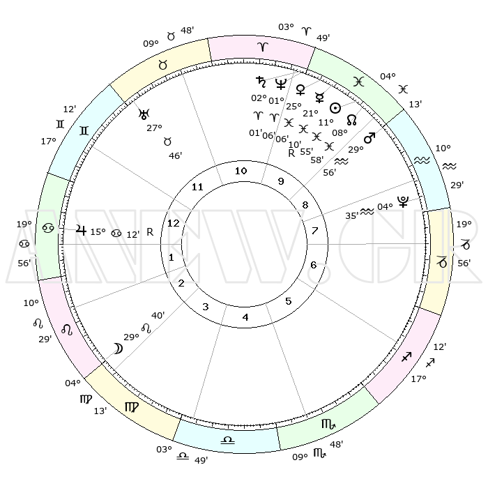 | | ΘΕΣΕΙΣ ΠΛΑΝΗΤΩΝ ΑΣΤΡΟΛΟΓΙΚΟΥ ΧΑΡΤΗ ΤΗΣ ΣΤΙΓΜΗΣ ΑΥΤΗΣ | | | | Πλανήτης | Ζώδιο | Μοίρες | Δεκαήμ. | Σε οίκο | Απόκλιση | | Ακμές των οίκων | | Ηλιος | Ιχθείς | 11°51' | Δεύτερο | 10 | 07 S 07 | | 1ος | 29°14' | Δίδυμοι | | Σελήνη | Λέων | 28°46' | Τρίτο | 3 | 12 N 47 | | 2ος | 20°05' | Καρκίνος | | Ερμής | Ιχθείς | 21°13'R | Τρίτο | 10 | 00 S 16 | | 3ος | 11°50' | Λέων | | Αφροδίτη | Ιχθείς | 25°01' | Τρίτο | 10 | 03 S 12 | | 4ος | 08°02' | Παρθένος | | Αρης | Υδροχόος | 29°53' | Τρίτο | 9 | 12 S 32 | | 5ος | 11°51' | Ζυγός | | Δίας | Καρκίνος | 15°12'R | Δεύτερο | 1 | 22 N 55 | | 6ος | 21°54' | Σκορπιός | | Κρόνος | Κριός | 02°01' | Πρώτο | 10 | 01 S 09 | | 7ος | 29°14' | Τοξότης | | Ουρανός | Ταύρος | 27°46' | Τρίτο | 12 | 19 N 29 | | 8ος | 20°05' | Αιγόκερως | | Ποσειδώνας | Κριός | 01°06' | Πρώτο | 10 | 00 S 46 | | 9ος | 11°50' | Υδροχόος | | Πλούτωνας | Υδροχόος | 04°34' | Πρώτο | 8 | 22 S 52 | | 10ος | 08°02' | Ιχθείς | | Β. Δεσμός | Ιχθείς | 08°58' | Πρώτο | 10 | 08 S 12 | | 11ος | 11°51' | Κριός | | Ωροσκόπος | Δίδυμοι | 29°14' | Τρίτο | | | 12ος | 21°54' | Ταύρος | | Μεσουράνημα | Ιχθείς | 08°02' | Πρώτο | | | |