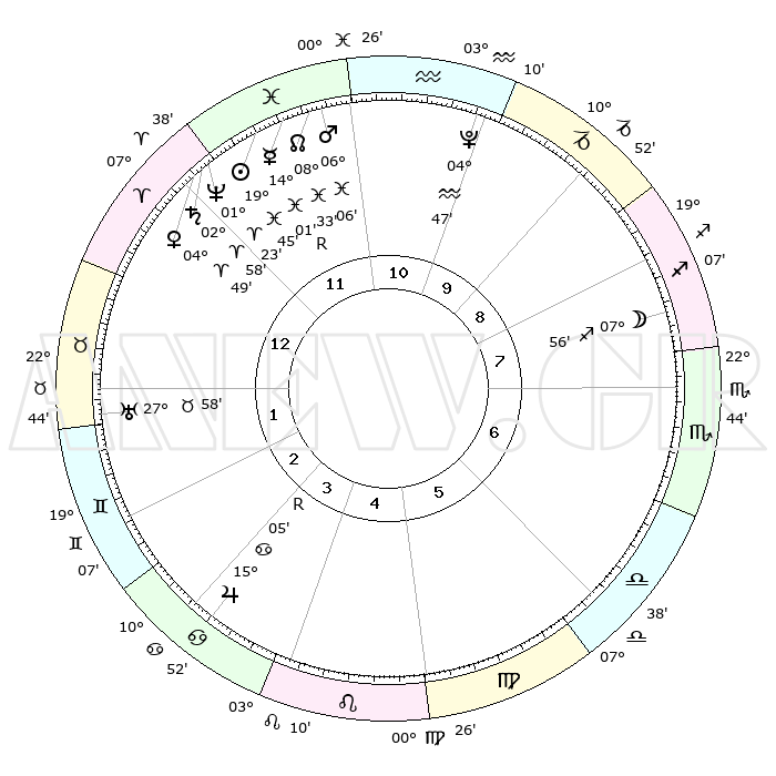 | | ΘΕΣΕΙΣ ΠΛΑΝΗΤΩΝ ΑΣΤΡΟΛΟΓΙΚΟΥ ΧΑΡΤΗ ΤΗΣ ΣΤΙΓΜΗΣ ΑΥΤΗΣ | | | | Πλανήτης | Ζώδιο | Μοίρες | Δεκαήμ. | Σε οίκο | Απόκλιση | | Ακμές των οίκων | | Ηλιος | Ιχθείς | 19°41' | Δεύτερο | 12 | 04 S 05 | | 1ος | 20°23' | Κριός | | Σελήνη | Τοξότης | 07°11' | Πρώτο | 8 | 26 S 42 | | 2ος | 25°17' | Ταύρος | | Ερμής | Ιχθείς | 14°05'R | Δεύτερο | 12 | 03 S 10 | | 3ος | 19°54' | Δίδυμοι | | Αφροδίτη | Κριός | 04°45' | Πρώτο | 12 | 00 N 48 | | 4ος | 11°38' | Καρκίνος | | Αρης | Ιχθείς | 06°03' | Πρώτο | 11 | 10 S 18 | | 5ος | 05°11' | Λέων | | Δίας | Καρκίνος | 15°05'R | Δεύτερο | 4 | 22 N 56 | | 6ος | 06°03' | Παρθένος | | Κρόνος | Κριός | 02°57' | Πρώτο | 12 | 00 S 47 | | 7ος | 20°23' | Ζυγός | | Ουρανός | Ταύρος | 27°58' | Τρίτο | 2 | 19 N 32 | | 8ος | 25°17' | Σκορπιός | | Ποσειδώνας | Κριός | 01°23' | Πρώτο | 12 | 00 S 39 | | 9ος | 19°54' | Τοξότης | | Πλούτωνας | Υδροχόος | 04°46' | Πρώτο | 10 | 22 S 50 | | 10ος | 11°38' | Αιγόκερως | | Β. Δεσμός | Ιχθείς | 08°33' | Πρώτο | 12 | 08 S 22 | | 11ος | 05°11' | Υδροχόος | | Ωροσκόπος | Κριός | 20°23' | Τρίτο | | | 12ος | 06°03' | Ιχθείς | | Μεσουράνημα | Αιγόκερως | 11°38' | Δεύτερο | | | |