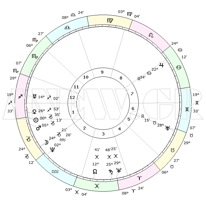 | | ΘΕΣΕΙΣ ΠΛΑΝΗΤΩΝ ΑΣΤΡΟΛΟΓΙΚΟΥ ΧΑΡΤΗ ΤΗΣ ΣΤΙΓΜΗΣ ΑΥΤΗΣ | | | | Πλανήτης | Ζώδιο | Μοίρες | Δεκαήμ. | Σε οίκο | Απόκλιση | | Ακμές των οίκων | | Ηλιος | Αιγόκερως | 00°31' | Πρώτο | 2 | 23 S 26 | | 1ος | 27°43' | Σκορπιός | | Σελήνη | Αιγόκερως | 23°27' | Τρίτο | 2 | 25 S 05 | | 2ος | 28°32' | Τοξότης | | Ερμής | Τοξότης | 13°56' | Δεύτερο | 1 | 21 S 51 | | 3ος | 03°52' | Υδροχόος | | Αφροδίτη | Τοξότης | 26°48' | Τρίτο | 1 | 23 S 31 | | 4ος | 09°51' | Ιχθείς | | Αρης | Αιγόκερως | 05°10' | Πρώτο | 2 | 24 S 09 | | 5ος | 11°09' | Κριός | | Δίας | Καρκίνος | 22°35'R | Τρίτο | 8 | 21 N 45 | | 6ος | 06°31' | Ταύρος | | Κρόνος | Ιχθείς | 25°47' | Τρίτο | 4 | 03 S 47 | | 7ος | 27°43' | Ταύρος | | Ουρανός | Ταύρος | 28°15'R | Τρίτο | 7 | 19 N 34 | | 8ος | 28°32' | Δίδυμοι | | Ποσειδώνας | Ιχθείς | 29°25' | Τρίτο | 4 | 01 S 28 | | 9ος | 03°52' | Λέων | | Πλούτωνας | Υδροχόος | 02°26' | Πρώτο | 2 | 23 S 17 | | 10ος | 09°51' | Παρθένος | | Β. Δεσμός | Ιχθείς | 12°42' | Δεύτερο | 4 | 06 S 48 | | 11ος | 11°09' | Ζυγός | | Ωροσκόπος | Σκορπιός | 27°43' | Τρίτο | | | 12ος | 06°31' | Σκορπιός | | Μεσουράνημα | Παρθένος | 09°51' | Πρώτο | | | |