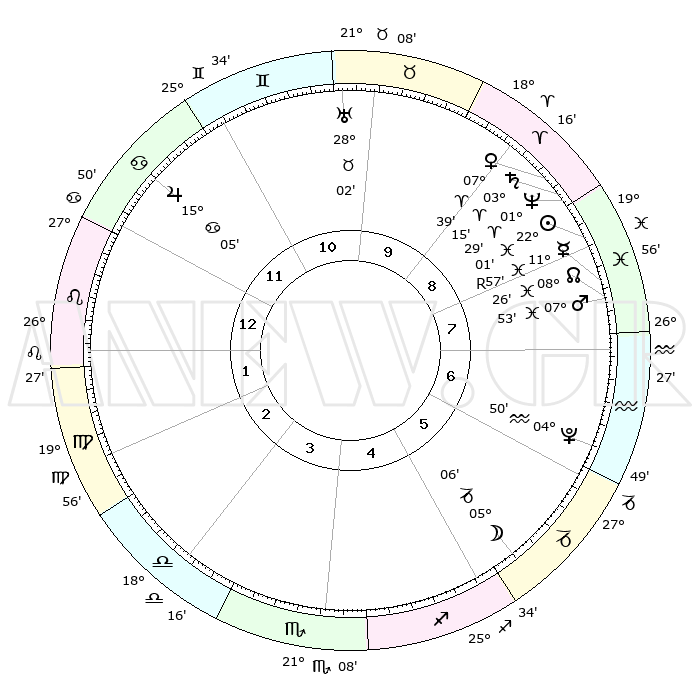 | | ΘΕΣΕΙΣ ΠΛΑΝΗΤΩΝ ΑΣΤΡΟΛΟΓΙΚΟΥ ΧΑΡΤΗ ΤΗΣ ΣΤΙΓΜΗΣ ΑΥΤΗΣ | | | | Πλανήτης | Ζώδιο | Μοίρες | Δεκαήμ. | Σε οίκο | Απόκλιση | | Ακμές των οίκων | | Ηλιος | Ιχθείς | 21°58' | Τρίτο | 8 | 03 S 11 | | 1ος | 09°46' | Λέων | | Σελήνη | Αιγόκερως | 04°24' | Πρώτο | 5 | 28 S 07 | | 2ος | 01°34' | Παρθένος | | Ερμής | Ιχθείς | 12°00'R | Δεύτερο | 8 | 04 S 20 | | 3ος | 27°56' | Παρθένος | | Αφροδίτη | Κριός | 07°35' | Πρώτο | 9 | 01 N 59 | | 4ος | 29°59' | Ζυγός | | Αρης | Ιχθείς | 07°51' | Πρώτο | 8 | 09 S 38 | | 5ος | 05°36' | Τοξότης | | Δίας | Καρκίνος | 15°05' | Δεύτερο | 12 | 22 N 56 | | 6ος | 09°48' | Αιγόκερως | | Κρόνος | Κριός | 03°14' | Πρώτο | 9 | 00 S 40 | | 7ος | 09°46' | Υδροχόος | | Ουρανός | Ταύρος | 28°02' | Τρίτο | 10 | 19 N 33 | | 8ος | 01°34' | Ιχθείς | | Ποσειδώνας | Κριός | 01°28' | Πρώτο | 9 | 00 S 37 | | 9ος | 27°56' | Ιχθείς | | Πλούτωνας | Υδροχόος | 04°50' | Πρώτο | 6 | 22 S 50 | | 10ος | 29°59' | Κριός | | Β. Δεσμός | Ιχθείς | 08°26' | Πρώτο | 8 | 08 S 24 | | 11ος | 05°36' | Δίδυμοι | | Ωροσκόπος | Λέων | 09°46' | Πρώτο | | | 12ος | 09°48' | Καρκίνος | | Μεσουράνημα | Κριός | 29°59' | Τρίτο | | | |