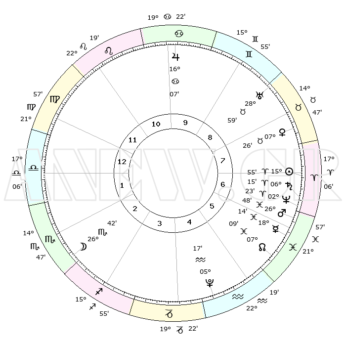 | | ΘΕΣΕΙΣ ΠΛΑΝΗΤΩΝ ΑΣΤΡΟΛΟΓΙΚΟΥ ΧΑΡΤΗ ΤΗΣ ΣΤΙΓΜΗΣ ΑΥΤΗΣ | | | | Πλανήτης | Ζώδιο | Μοίρες | Δεκαήμ. | Σε οίκο | Απόκλιση | | Ακμές των οίκων | | Ηλιος | Κριός | 15°48' | Δεύτερο | 8 | 06 N 13 | | 1ος | 12°33' | Παρθένος | | Σελήνη | Σκορπιός | 25°17' | Τρίτο | 3 | 23 S 58 | | 2ος | 07°40' | Ζυγός | | Ερμής | Ιχθείς | 18°06' | Δεύτερο | 7 | 06 S 28 | | 3ος | 07°17' | Σκορπιός | | Αφροδίτη | Ταύρος | 07°18' | Πρώτο | 9 | 13 N 42 | | 4ος | 10°13' | Τοξότης | | Αρης | Ιχθείς | 26°43' | Τρίτο | 7 | 02 S 15 | | 5ος | 13°41' | Αιγόκερως | | Δίας | Καρκίνος | 16°07' | Δεύτερο | 11 | 22 N 50 | | 6ος | 14°51' | Υδροχόος | | Κρόνος | Κριός | 06°14' | Πρώτο | 7 | 00 N 31 | | 7ος | 12°33' | Ιχθείς | | Ουρανός | Ταύρος | 28°58' | Τρίτο | 9 | 19 N 45 | | 8ος | 07°40' | Κριός | | Ποσειδώνας | Κριός | 02°23' | Πρώτο | 7 | 00 S 15 | | 9ος | 07°17' | Ταύρος | | Πλούτωνας | Υδροχόος | 05°17' | Πρώτο | 5 | 22 S 47 | | 10ος | 10°13' | Δίδυμοι | | Β. Δεσμός | Ιχθείς | 07°10' | Πρώτο | 6 | 08 S 53 | | 11ος | 13°41' | Καρκίνος | | Ωροσκόπος | Παρθένος | 12°33' | Δεύτερο | | | 12ος | 14°51' | Λέων | | Μεσουράνημα | Δίδυμοι | 10°13' | Δεύτερο | | | |
