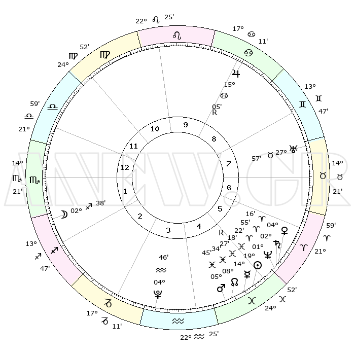 | | ΘΕΣΕΙΣ ΠΛΑΝΗΤΩΝ ΑΣΤΡΟΛΟΓΙΚΟΥ ΧΑΡΤΗ ΤΗΣ ΣΤΙΓΜΗΣ ΑΥΤΗΣ | | | | Πλανήτης | Ζώδιο | Μοίρες | Δεκαήμ. | Σε οίκο | Απόκλιση | | Ακμές των οίκων | | Ηλιος | Ιχθείς | 18°32' | Δεύτερο | 2 | 04 S 32 | | 1ος | 29°55' | Αιγόκερως | | Σελήνη | Σκορπιός | 23°30' | Τρίτο | 10 | 23 S 34 | | 2ος | 14°01' | Ιχθείς | | Ερμής | Ιχθείς | 15°13'R | Δεύτερο | 2 | 02 S 36 | | 3ος | 22°28' | Κριός | | Αφροδίτη | Κριός | 03°19' | Πρώτο | 2 | 00 N 13 | | 4ος | 20°57' | Ταύρος | | Αρης | Ιχθείς | 05°08' | Πρώτο | 1 | 10 S 38 | | 5ος | 13°43' | Δίδυμοι | | Δίας | Καρκίνος | 15°06'R | Δεύτερο | 6 | 22 N 56 | | 6ος | 05°08' | Καρκίνος | | Κρόνος | Κριός | 02°49' | Πρώτο | 2 | 00 S 50 | | 7ος | 29°55' | Καρκίνος | | Ουρανός | Ταύρος | 27°56' | Τρίτο | 4 | 19 N 31 | | 8ος | 14°01' | Παρθένος | | Ποσειδώνας | Κριός | 01°21' | Πρώτο | 2 | 00 S 40 | | 9ος | 22°28' | Ζυγός | | Πλούτωνας | Υδροχόος | 04°45' | Πρώτο | 1 | 22 S 51 | | 10ος | 20°57' | Σκορπιός | | Β. Δεσμός | Ιχθείς | 08°37' | Πρώτο | 1 | 08 S 20 | | 11ος | 13°43' | Τοξότης | | Ωροσκόπος | Αιγόκερως | 29°55' | Τρίτο | | | 12ος | 05°08' | Αιγόκερως | | Μεσουράνημα | Σκορπιός | 20°57' | Τρίτο | | | |