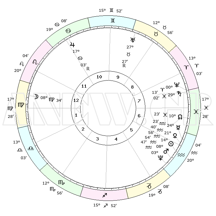| | ΘΕΣΕΙΣ ΠΛΑΝΗΤΩΝ ΑΣΤΡΟΛΟΓΙΚΟΥ ΧΑΡΤΗ ΤΗΣ ΣΤΙΓΜΗΣ ΑΥΤΗΣ | | | | Πλανήτης | Ζώδιο | Μοίρες | Δεκαήμ. | Σε οίκο | Απόκλιση | | Ακμές των οίκων | | Ηλιος | Υδροχόος | 14°26' | Δεύτερο | 12 | 16 S 30 | | 1ος | 05°50' | Ιχθείς | | Σελήνη | Παρθένος | 01°48' | Πρώτο | 6 | 11 N 27 | | 2ος | 20°40' | Κριός | | Ερμής | Υδροχόος | 23°30' | Τρίτο | 12 | 15 S 18 | | 3ος | 22°15' | Ταύρος | | Αφροδίτη | Υδροχόος | 21°02' | Τρίτο | 12 | 15 S 48 | | 4ος | 16°07' | Δίδυμοι | | Αρης | Υδροχόος | 08°31' | Πρώτο | 12 | 19 S 09 | | 5ος | 07°48' | Καρκίνος | | Δίας | Καρκίνος | 17°06'R | Δεύτερο | 5 | 22 N 39 | | 6ος | 01°59' | Λέων | | Κρόνος | Ιχθείς | 28°59' | Τρίτο | 1 | 02 S 24 | | 7ος | 05°50' | Παρθένος | | Ουρανός | Ταύρος | 27°27'R | Τρίτο | 3 | 19 N 24 | | 8ος | 20°40' | Ζυγός | | Ποσειδώνας | Κριός | 00°12' | Πρώτο | 1 | 01 S 07 | | 9ος | 22°15' | Σκορπιός | | Πλούτωνας | Υδροχόος | 03°46' | Πρώτο | 12 | 23 S 00 | | 10ος | 16°07' | Τοξότης | | Β. Δεσμός | Ιχθείς | 10°24' | Δεύτερο | 1 | 07 S 40 | | 11ος | 07°48' | Αιγόκερως | | Ωροσκόπος | Ιχθείς | 05°50' | Πρώτο | | | 12ος | 01°59' | Υδροχόος | | Μεσουράνημα | Τοξότης | 16°07' | Δεύτερο | | | |