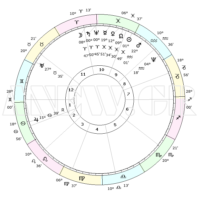 | | ΘΕΣΕΙΣ ΠΛΑΝΗΤΩΝ ΑΣΤΡΟΛΟΓΙΚΟΥ ΧΑΡΤΗ ΤΗΣ ΣΤΙΓΜΗΣ ΑΥΤΗΣ | | | | Πλανήτης | Ζώδιο | Μοίρες | Δεκαήμ. | Σε οίκο | Απόκλιση | | Ακμές των οίκων | | Ηλιος | Ιχθείς | 01°45' | Πρώτο | 10 | 10 S 51 | | 1ος | 01°18' | Δίδυμοι | | Σελήνη | Κριός | 07°47' | Πρώτο | 11 | 05 N 26 | | 2ος | 25°51' | Δίδυμοι | | Ερμής | Ιχθείς | 19°48' | Δεύτερο | 11 | 02 S 48 | | 3ος | 17°14' | Καρκίνος | | Αφροδίτη | Ιχθείς | 12°28' | Δεύτερο | 11 | 08 S 13 | | 4ος | 10°05' | Λέων | | Αρης | Υδροχόος | 21°58' | Τρίτο | 10 | 15 S 13 | | 5ος | 08°47' | Παρθένος | | Δίας | Καρκίνος | 15°39'R | Δεύτερο | 2 | 22 N 51 | | 6ος | 17°26' | Ζυγός | | Κρόνος | Κριός | 00°50' | Πρώτο | 11 | 01 S 38 | | 7ος | 01°18' | Τοξότης | | Ουρανός | Ταύρος | 27°35' | Τρίτο | 12 | 19 N 26 | | 8ος | 25°51' | Τοξότης | | Ποσειδώνας | Κριός | 00°45' | Πρώτο | 11 | 00 S 54 | | 9ος | 17°14' | Αιγόκερως | | Πλούτωνας | Υδροχόος | 04°18' | Πρώτο | 9 | 22 S 55 | | 10ος | 10°05' | Υδροχόος | | Β. Δεσμός | Ιχθείς | 09°30' | Πρώτο | 11 | 08 S 00 | | 11ος | 08°47' | Ιχθείς | | Ωροσκόπος | Δίδυμοι | 01°18' | Πρώτο | | | 12ος | 17°26' | Κριός | | Μεσουράνημα | Υδροχόος | 10°05' | Δεύτερο | | | |