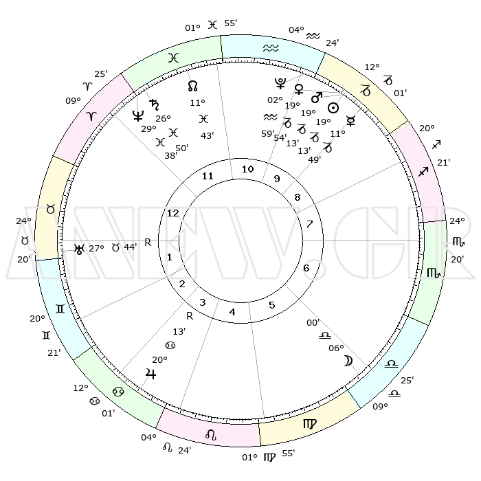 | | ΘΕΣΕΙΣ ΠΛΑΝΗΤΩΝ ΑΣΤΡΟΛΟΓΙΚΟΥ ΧΑΡΤΗ ΤΗΣ ΣΤΙΓΜΗΣ ΑΥΤΗΣ | | | | Πλανήτης | Ζώδιο | Μοίρες | Δεκαήμ. | Σε οίκο | Απόκλιση | | Ακμές των οίκων | | Ηλιος | Αιγόκερως | 19°42' | Δεύτερο | 3 | 21 S 59 | | 1ος | 21°09' | Ζυγός | | Σελήνη | Ζυγός | 11°48' | Δεύτερο | 12 | 07 S 08 | | 2ος | 19°03' | Σκορπιός | | Ερμής | Αιγόκερως | 12°34' | Δεύτερο | 3 | 24 S 16 | | 3ος | 20°24' | Τοξότης | | Αφροδίτη | Αιγόκερως | 20°29' | Τρίτο | 3 | 22 S 41 | | 4ος | 24°03' | Αιγόκερως | | Αρης | Αιγόκερως | 19°35' | Δεύτερο | 3 | 22 S 56 | | 5ος | 27°01' | Υδροχόος | | Δίας | Καρκίνος | 20°09'R | Τρίτο | 9 | 22 N 11 | | 6ος | 26°23' | Ιχθείς | | Κρόνος | Ιχθείς | 26°52' | Τρίτο | 6 | 03 S 18 | | 7ος | 21°09' | Κριός | | Ουρανός | Ταύρος | 27°44'R | Τρίτο | 8 | 19 N 27 | | 8ος | 19°03' | Ταύρος | | Ποσειδώνας | Ιχθείς | 29°39' | Τρίτο | 6 | 01 S 22 | | 9ος | 20°24' | Δίδυμοι | | Πλούτωνας | Υδροχόος | 02°60' | Πρώτο | 4 | 23 S 10 | | 10ος | 24°03' | Καρκίνος | | Β. Δεσμός | Ιχθείς | 11°42' | Δεύτερο | 5 | 07 S 11 | | 11ος | 27°01' | Λέων | | Ωροσκόπος | Ζυγός | 21°09' | Τρίτο | | | 12ος | 26°23' | Παρθένος | | Μεσουράνημα | Καρκίνος | 24°03' | Τρίτο | | | |