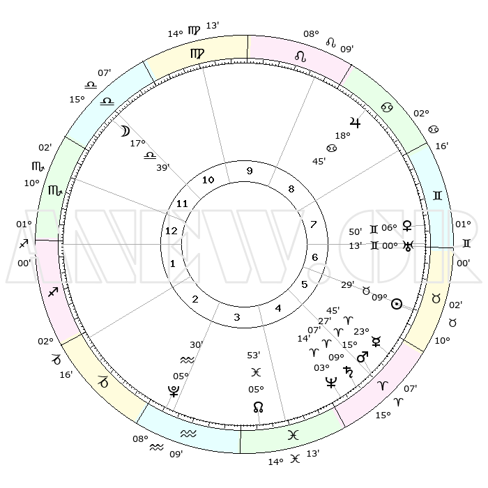 | | ΘΕΣΕΙΣ ΠΛΑΝΗΤΩΝ ΑΣΤΡΟΛΟΓΙΚΟΥ ΧΑΡΤΗ ΤΗΣ ΣΤΙΓΜΗΣ ΑΥΤΗΣ | | | | Πλανήτης | Ζώδιο | Μοίρες | Δεκαήμ. | Σε οίκο | Απόκλιση | | Ακμές των οίκων | | Ηλιος | Ταύρος | 06°47' | Πρώτο | 2 | 13 N 46 | | 1ος | 20°06' | Υδροχόος | | Σελήνη | Παρθένος | 12°38' | Δεύτερο | 7 | 06 N 23 | | 2ος | 05°55' | Κριός | | Ερμής | Κριός | 18°47' | Δεύτερο | 2 | 05 N 14 | | 3ος | 10°36' | Ταύρος | | Αφροδίτη | Δίδυμοι | 03°28' | Πρώτο | 3 | 21 N 33 | | 4ος | 06°06' | Δίδυμοι | | Αρης | Κριός | 13°20' | Δεύτερο | 2 | 04 N 25 | | 5ος | 27°55' | Δίδυμοι | | Δίας | Καρκίνος | 18°23' | Δεύτερο | 5 | 22 N 33 | | 6ος | 20°33' | Καρκίνος | | Κρόνος | Κριός | 08°48' | Πρώτο | 2 | 01 N 30 | | 7ος | 20°06' | Λέων | | Ουρανός | Δίδυμοι | 00°03' | Πρώτο | 3 | 20 N 00 | | 8ος | 05°55' | Ζυγός | | Ποσειδώνας | Κριός | 03°08' | Πρώτο | 1 | 00 N 02 | | 9ος | 10°36' | Σκορπιός | | Πλούτωνας | Υδροχόος | 05°29' | Πρώτο | 12 | 22 S 48 | | 10ος | 06°06' | Τοξότης | | Β. Δεσμός | Ιχθείς | 06°02' | Πρώτο | 1 | 09 S 18 | | 11ος | 27°55' | Τοξότης | | Ωροσκόπος | Υδροχόος | 20°06' | Τρίτο | | | 12ος | 20°33' | Αιγόκερως | | Μεσουράνημα | Τοξότης | 06°06' | Πρώτο | | | |