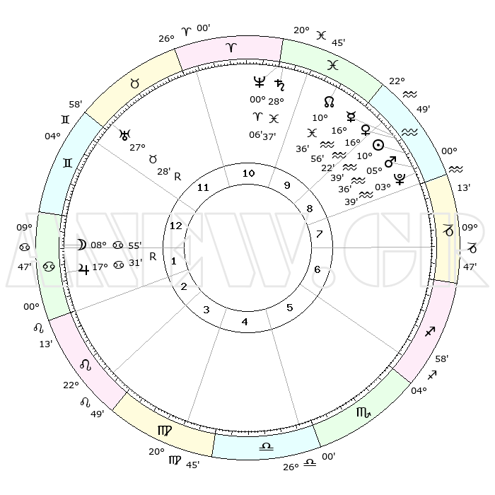 | | ΘΕΣΕΙΣ ΠΛΑΝΗΤΩΝ ΑΣΤΡΟΛΟΓΙΚΟΥ ΧΑΡΤΗ ΤΗΣ ΣΤΙΓΜΗΣ ΑΥΤΗΣ | | | | Πλανήτης | Ζώδιο | Μοίρες | Δεκαήμ. | Σε οίκο | Απόκλιση | | Ακμές των οίκων | | Ηλιος | Υδροχόος | 10°35' | Δεύτερο | 9 | 17 S 35 | | 1ος | 15°54' | Δίδυμοι | | Σελήνη | Καρκίνος | 07°54' | Πρώτο | 1 | 27 N 46 | | 2ος | 08°03' | Καρκίνος | | Ερμής | Υδροχόος | 16°48' | Δεύτερο | 9 | 17 S 40 | | 3ος | 29°17' | Καρκίνος | | Αφροδίτη | Υδροχόος | 16°17' | Δεύτερο | 9 | 17 S 14 | | 4ος | 23°36' | Λέων | | Αρης | Υδροχόος | 05°33' | Πρώτο | 9 | 19 S 53 | | 5ος | 25°01' | Παρθένος | | Δίας | Καρκίνος | 17°32'R | Δεύτερο | 2 | 22 N 35 | | 6ος | 05°10' | Σκορπιός | | Κρόνος | Ιχθείς | 28°36' | Τρίτο | 11 | 02 S 33 | | 7ος | 15°54' | Τοξότης | | Ουρανός | Ταύρος | 27°28'R | Τρίτο | 12 | 19 N 24 | | 8ος | 08°03' | Αιγόκερως | | Ποσειδώνας | Κριός | 00°06' | Πρώτο | 11 | 01 S 10 | | 9ος | 29°17' | Αιγόκερως | | Πλούτωνας | Υδροχόος | 03°39' | Πρώτο | 9 | 23 S 02 | | 10ος | 23°36' | Υδροχόος | | Β. Δεσμός | Ιχθείς | 10°36' | Δεύτερο | 10 | 07 S 35 | | 11ος | 25°01' | Ιχθείς | | Ωροσκόπος | Δίδυμοι | 15°54' | Δεύτερο | | | 12ος | 05°10' | Ταύρος | | Μεσουράνημα | Υδροχόος | 23°36' | Τρίτο | | | |