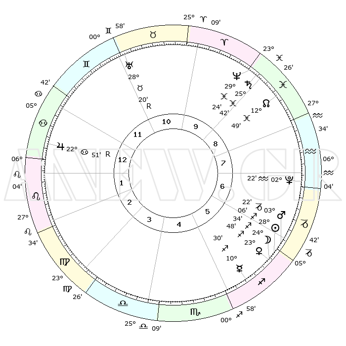 | | ΘΕΣΕΙΣ ΠΛΑΝΗΤΩΝ ΑΣΤΡΟΛΟΓΙΚΟΥ ΧΑΡΤΗ ΤΗΣ ΣΤΙΓΜΗΣ ΑΥΤΗΣ | | | | Πλανήτης | Ζώδιο | Μοίρες | Δεκαήμ. | Σε οίκο | Απόκλιση | | Ακμές των οίκων | | Ηλιος | Τοξότης | 28°01' | Τρίτο | 6 | 23 S 25 | | 1ος | 15°32' | Καρκίνος | | Σελήνη | Τοξότης | 23°44' | Τρίτο | 6 | 28 S 11 | | 2ος | 05°58' | Λέων | | Ερμής | Τοξότης | 10°24' | Δεύτερο | 5 | 21 S 04 | | 3ος | 29°11' | Λέων | | Αφροδίτη | Τοξότης | 23°43' | Τρίτο | 6 | 23 S 18 | | 4ος | 28°04' | Παρθένος | | Αρης | Αιγόκερως | 03°19' | Πρώτο | 6 | 24 S 12 | | 5ος | 03°50' | Σκορπιός | | Δίας | Καρκίνος | 22°52'R | Τρίτο | 1 | 21 N 42 | | 6ος | 11°57' | Τοξότης | | Κρόνος | Ιχθείς | 25°42' | Τρίτο | 9 | 03 S 50 | | 7ος | 15°32' | Αιγόκερως | | Ουρανός | Ταύρος | 28°20'R | Τρίτο | 11 | 19 N 35 | | 8ος | 05°58' | Υδροχόος | | Ποσειδώνας | Ιχθείς | 29°24' | Τρίτο | 10 | 01 S 28 | | 9ος | 29°11' | Υδροχόος | | Πλούτωνας | Υδροχόος | 02°22' | Πρώτο | 7 | 23 S 18 | | 10ος | 28°04' | Ιχθείς | | Β. Δεσμός | Ιχθείς | 12°49' | Δεύτερο | 9 | 06 S 45 | | 11ος | 03°50' | Ταύρος | | Ωροσκόπος | Καρκίνος | 15°32' | Δεύτερο | | | 12ος | 11°57' | Δίδυμοι | | Μεσουράνημα | Ιχθείς | 28°04' | Τρίτο | | | |