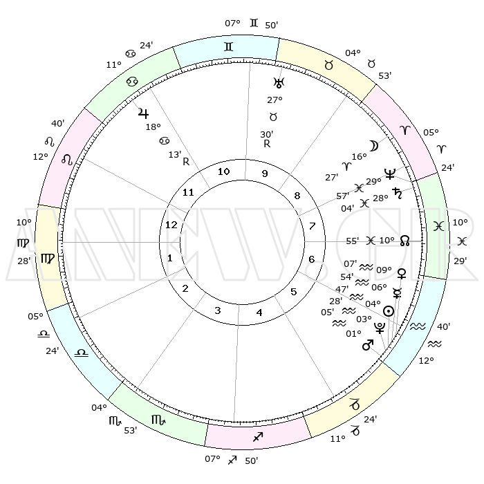 | | ΘΕΣΕΙΣ ΠΛΑΝΗΤΩΝ ΑΣΤΡΟΛΟΓΙΚΟΥ ΧΑΡΤΗ ΤΗΣ ΣΤΙΓΜΗΣ ΑΥΤΗΣ | | | | Πλανήτης | Ζώδιο | Μοίρες | Δεκαήμ. | Σε οίκο | Απόκλιση | | Ακμές των οίκων | | Ηλιος | Υδροχόος | 04°42' | Πρώτο | 6 | 19 S 05 | | 1ος | 18°03' | Λέων | | Σελήνη | Κριός | 15°24' | Δεύτερο | 9 | 08 N 53 | | 2ος | 10°39' | Παρθένος | | Ερμής | Υδροχόος | 06°46' | Πρώτο | 6 | 20 S 36 | | 3ος | 08°04' | Ζυγός | | Αφροδίτη | Υδροχόος | 09°01' | Πρώτο | 6 | 19 S 11 | | 4ος | 10°39' | Σκορπιός | | Αρης | Υδροχόος | 01°02' | Πρώτο | 6 | 20 S 55 | | 5ος | 15°42' | Τοξότης | | Δίας | Καρκίνος | 18°13'R | Δεύτερο | 11 | 22 N 29 | | 6ος | 18°49' | Αιγόκερως | | Κρόνος | Ιχθείς | 28°04' | Τρίτο | 8 | 02 S 47 | | 7ος | 18°03' | Υδροχόος | | Ουρανός | Ταύρος | 27°30'R | Τρίτο | 10 | 19 N 25 | | 8ος | 10°39' | Ιχθείς | | Ποσειδώνας | Ιχθείς | 29°57' | Τρίτο | 8 | 01 S 14 | | 9ος | 08°04' | Κριός | | Πλούτωνας | Υδροχόος | 03°28' | Πρώτο | 6 | 23 S 04 | | 10ος | 10°39' | Ταύρος | | Β. Δεσμός | Ιχθείς | 10°55' | Δεύτερο | 8 | 07 S 28 | | 11ος | 15°42' | Δίδυμοι | | Ωροσκόπος | Λέων | 18°03' | Δεύτερο | | | 12ος | 18°49' | Καρκίνος | | Μεσουράνημα | Ταύρος | 10°39' | Δεύτερο | | | |