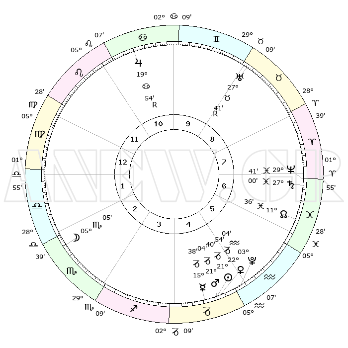 | | ΘΕΣΕΙΣ ΠΛΑΝΗΤΩΝ ΑΣΤΡΟΛΟΓΙΚΟΥ ΧΑΡΤΗ ΤΗΣ ΣΤΙΓΜΗΣ ΑΥΤΗΣ | | | | Πλανήτης | Ζώδιο | Μοίρες | Δεκαήμ. | Σε οίκο | Απόκλιση | | Ακμές των οίκων | | Ηλιος | Αιγόκερως | 21°28' | Τρίτο | 6 | 21 S 43 | | 1ος | 07°10' | Λέων | | Σελήνη | Σκορπιός | 02°51' | Πρώτο | 4 | 16 S 17 | | 2ος | 28°45' | Λέων | | Ερμής | Αιγόκερως | 15°20' | Δεύτερο | 6 | 24 S 06 | | 3ος | 24°46' | Παρθένος | | Αφροδίτη | Αιγόκερως | 22°40' | Τρίτο | 6 | 22 S 24 | | 4ος | 26°35' | Ζυγός | | Αρης | Αιγόκερως | 20°56' | Τρίτο | 6 | 22 S 45 | | 5ος | 02°21' | Τοξότης | | Δίας | Καρκίνος | 19°55'R | Δεύτερο | 12 | 22 N 13 | | 6ος | 06°55' | Αιγόκερως | | Κρόνος | Ιχθείς | 26°60' | Τρίτο | 9 | 03 S 14 | | 7ος | 07°10' | Υδροχόος | | Ουρανός | Ταύρος | 27°41'R | Τρίτο | 10 | 19 N 27 | | 8ος | 28°45' | Υδροχόος | | Ποσειδώνας | Ιχθείς | 29°40' | Τρίτο | 9 | 01 S 21 | | 9ος | 24°46' | Ιχθείς | | Πλούτωνας | Υδροχόος | 03°03' | Πρώτο | 6 | 23 S 09 | | 10ος | 26°35' | Κριός | | Β. Δεσμός | Ιχθείς | 11°36' | Δεύτερο | 8 | 07 S 13 | | 11ος | 02°21' | Δίδυμοι | | Ωροσκόπος | Λέων | 07°10' | Πρώτο | | | 12ος | 06°55' | Καρκίνος | | Μεσουράνημα | Κριός | 26°35' | Τρίτο | | | |