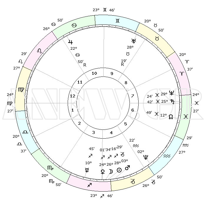 | | ΘΕΣΕΙΣ ΠΛΑΝΗΤΩΝ ΑΣΤΡΟΛΟΓΙΚΟΥ ΧΑΡΤΗ ΤΗΣ ΣΤΙΓΜΗΣ ΑΥΤΗΣ | | | | Πλανήτης | Ζώδιο | Μοίρες | Δεκαήμ. | Σε οίκο | Απόκλιση | | Ακμές των οίκων | | Ηλιος | Τοξότης | 28°11' | Τρίτο | 4 | 23 S 25 | | 1ος | 01°14' | Παρθένος | | Σελήνη | Τοξότης | 25°37' | Τρίτο | 4 | 28 S 13 | | 2ος | 25°13' | Παρθένος | | Ερμής | Τοξότης | 10°38' | Δεύτερο | 4 | 21 S 08 | | 3ος | 24°00' | Ζυγός | | Αφροδίτη | Τοξότης | 23°55' | Τρίτο | 4 | 23 S 19 | | 4ος | 26°56' | Σκορπιός | | Αρης | Αιγόκερως | 03°26' | Πρώτο | 5 | 24 S 12 | | 5ος | 01°02' | Αιγόκερως | | Δίας | Καρκίνος | 22°51'R | Τρίτο | 11 | 21 N 42 | | 6ος | 02°54' | Υδροχόος | | Κρόνος | Ιχθείς | 25°42' | Τρίτο | 8 | 03 S 49 | | 7ος | 01°14' | Ιχθείς | | Ουρανός | Ταύρος | 28°19'R | Τρίτο | 10 | 19 N 35 | | 8ος | 25°13' | Ιχθείς | | Ποσειδώνας | Ιχθείς | 29°24' | Τρίτο | 8 | 01 S 28 | | 9ος | 24°00' | Κριός | | Πλούτωνας | Υδροχόος | 02°22' | Πρώτο | 5 | 23 S 18 | | 10ος | 26°56' | Ταύρος | | Β. Δεσμός | Ιχθείς | 12°49' | Δεύτερο | 7 | 06 S 45 | | 11ος | 01°02' | Καρκίνος | | Ωροσκόπος | Παρθένος | 01°14' | Πρώτο | | | 12ος | 02°54' | Λέων | | Μεσουράνημα | Ταύρος | 26°56' | Τρίτο | | | |
