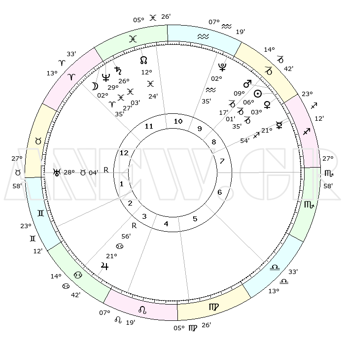 | | ΘΕΣΕΙΣ ΠΛΑΝΗΤΩΝ ΑΣΤΡΟΛΟΓΙΚΟΥ ΧΑΡΤΗ ΤΗΣ ΣΤΙΓΜΗΣ ΑΥΤΗΣ | | | | Πλανήτης | Ζώδιο | Μοίρες | Δεκαήμ. | Σε οίκο | Απόκλιση | | Ακμές των οίκων | | Ηλιος | Αιγόκερως | 05°56' | Πρώτο | 9 | 23 S 18 | | 1ος | 22°43' | Κριός | | Σελήνη | Κριός | 01°38' | Πρώτο | 12 | 02 N 16 | | 2ος | 26°58' | Ταύρος | | Ερμής | Τοξότης | 21°48' | Τρίτο | 9 | 23 S 13 | | 3ος | 21°19' | Δίδυμοι | | Αφροδίτη | Αιγόκερως | 03°30' | Πρώτο | 9 | 23 S 43 | | 4ος | 13°01' | Καρκίνος | | Αρης | Αιγόκερως | 09°13' | Πρώτο | 9 | 23 S 58 | | 5ος | 06°45' | Λέων | | Δίας | Καρκίνος | 21°56'R | Τρίτο | 4 | 21 N 52 | | 6ος | 08°04' | Παρθένος | | Κρόνος | Ιχθείς | 26°02' | Τρίτο | 12 | 03 S 40 | | 7ος | 22°43' | Ζυγός | | Ουρανός | Ταύρος | 28°05'R | Τρίτο | 2 | 19 N 32 | | 8ος | 26°58' | Σκορπιός | | Ποσειδώνας | Ιχθείς | 29°27' | Τρίτο | 12 | 01 S 26 | | 9ος | 21°19' | Τοξότης | | Πλούτωνας | Υδροχόος | 02°35' | Πρώτο | 10 | 23 S 15 | | 10ος | 13°01' | Αιγόκερως | | Β. Δεσμός | Ιχθείς | 12°25' | Δεύτερο | 12 | 06 S 54 | | 11ος | 06°45' | Υδροχόος | | Ωροσκόπος | Κριός | 22°43' | Τρίτο | | | 12ος | 08°04' | Ιχθείς | | Μεσουράνημα | Αιγόκερως | 13°01' | Δεύτερο | | | |