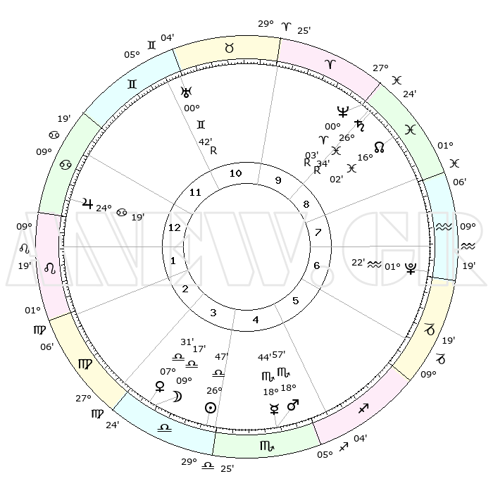 | ΘΕΣΕΙΣ ΠΛΑΝΗΤΩΝ ΑΣΤΡΟΛΟΓΙΚΟΥ ΧΑΡΤΗ ΤΗΣ ΣΤΙΓΜΗΣ ΑΥΤΗΣ | | Πλανήτης | Ζώδιο | Μοίρες | Δεκαήμ. | Σε οίκο | Απόκλιση | | Ακμές των οίκων | Ηλιος | Ζυγός | 26°39' | Τρίτο | 5 | 10 S 17 | | 1ος | 28°07' | Δίδυμοι | Σελήνη | Ζυγός | 07°38' | Πρώτο | 4 | 04 S 38 | | 2ος | 19°02' | Καρκίνος | Ερμής | Σκορπιός | 18°33' | Δεύτερο | 5 | 19 S 28 | | 3ος | 10°43' | Λέων | Αφροδίτη | Ζυγός | 07°21' | Πρώτο | 4 | 01 S 30 | | 4ος | 06°44' | Παρθένος | Αρης | Σκορπιός | 18°51' | Δεύτερο | 5 | 17 S 41 | | 5ος | 10°22' | Ζυγός | Δίας | Καρκίνος | 24°18' | Τρίτο | 2 | 21 N 18 | | 6ος | 20°29' | Σκορπιός | Κρόνος | Ιχθείς | 26°35'R | Τρίτο | 10 | 03 S 39 | | 7ος | 28°07' | Τοξότης | Ουρανός | Δίδυμοι | 00°42'R | Πρώτο | 12 | 20 N 05 | | 8ος | 19°02' | Αιγόκερως | Ποσειδώνας | Κριός | 00°03'R | Πρώτο | 10 | 01 S 14 | | 9ος | 10°43' | Υδροχόος | Πλούτωνας | Υδροχόος | 01°22' | Πρώτο | 8 | 23 S 32 | | 10ος | 06°44' | Ιχθείς | Β. Δεσμός | Ιχθείς | 16°03' | Δεύτερο | 10 | 05 S 30 | | 11ος | 10°22' | Κριός | Ωροσκόπος | Δίδυμοι | 28°07' | Τρίτο | | | 12ος | 20°29' | Ταύρος | Μεσουράνημα | Ιχθείς | 06°44' | Πρώτο | | | |