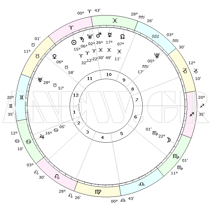 | | ΘΕΣΕΙΣ ΠΛΑΝΗΤΩΝ ΑΣΤΡΟΛΟΓΙΚΟΥ ΧΑΡΤΗ ΤΗΣ ΣΤΙΓΜΗΣ ΑΥΤΗΣ | | | | Πλανήτης | Ζώδιο | Μοίρες | Δεκαήμ. | Σε οίκο | Απόκλιση | | Ακμές των οίκων | | Ηλιος | Κριός | 15°16' | Δεύτερο | 2 | 06 N 01 | | 1ος | 02°03' | Υδροχόος | | Σελήνη | Σκορπιός | 18°40' | Δεύτερο | 9 | 22 S 03 | | 2ος | 16°29' | Ιχθείς | | Ερμής | Ιχθείς | 17°32' | Δεύτερο | 2 | 06 S 38 | | 3ος | 24°36' | Κριός | | Αφροδίτη | Ταύρος | 06°37' | Πρώτο | 3 | 13 N 28 | | 4ος | 22°43' | Ταύρος | | Αρης | Ιχθείς | 26°17' | Τρίτο | 2 | 02 S 25 | | 5ος | 15°20' | Δίδυμοι | | Δίας | Καρκίνος | 16°04' | Δεύτερο | 6 | 22 N 50 | | 6ος | 06°49' | Καρκίνος | | Κρόνος | Κριός | 06°10' | Πρώτο | 2 | 00 N 29 | | 7ος | 02°03' | Λέων | | Ουρανός | Ταύρος | 28°57' | Τρίτο | 4 | 19 N 45 | | 8ος | 16°29' | Παρθένος | | Ποσειδώνας | Κριός | 02°22' | Πρώτο | 2 | 00 S 16 | | 9ος | 24°36' | Ζυγός | | Πλούτωνας | Υδροχόος | 05°17' | Πρώτο | 1 | 22 S 47 | | 10ος | 22°43' | Σκορπιός | | Β. Δεσμός | Ιχθείς | 07°11' | Πρώτο | 1 | 08 S 52 | | 11ος | 15°20' | Τοξότης | | Ωροσκόπος | Υδροχόος | 02°03' | Πρώτο | | | 12ος | 06°49' | Αιγόκερως | | Μεσουράνημα | Σκορπιός | 22°43' | Τρίτο | | | |