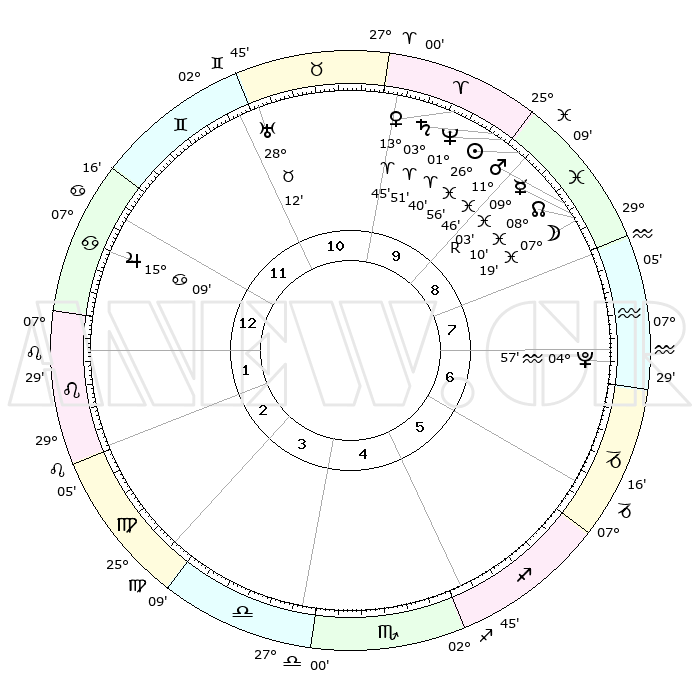 | | ΘΕΣΕΙΣ ΠΛΑΝΗΤΩΝ ΑΣΤΡΟΛΟΓΙΚΟΥ ΧΑΡΤΗ ΤΗΣ ΣΤΙΓΜΗΣ ΑΥΤΗΣ | | | | Πλανήτης | Ζώδιο | Μοίρες | Δεκαήμ. | Σε οίκο | Απόκλιση | | Ακμές των οίκων | | Ηλιος | Ιχθείς | 26°51' | Τρίτο | 9 | 01 S 15 | | 1ος | 17°38' | Καρκίνος | | Σελήνη | Ιχθείς | 06°25' | Πρώτο | 9 | 09 S 23 | | 2ος | 08°07' | Λέων | | Ερμής | Ιχθείς | 09°04'R | Πρώτο | 9 | 06 S 29 | | 3ος | 01°34' | Παρθένος | | Αφροδίτη | Κριός | 13°41' | Δεύτερο | 10 | 04 N 30 | | 4ος | 00°48' | Ζυγός | | Αρης | Ιχθείς | 11°43' | Δεύτερο | 9 | 08 S 10 | | 5ος | 06°41' | Σκορπιός | | Δίας | Καρκίνος | 15°09' | Δεύτερο | 12 | 22 N 56 | | 6ος | 14°28' | Τοξότης | | Κρόνος | Κριός | 03°51' | Πρώτο | 10 | 00 S 25 | | 7ος | 17°38' | Αιγόκερως | | Ουρανός | Ταύρος | 28°12' | Τρίτο | 11 | 19 N 35 | | 8ος | 08°07' | Υδροχόος | | Ποσειδώνας | Κριός | 01°40' | Πρώτο | 10 | 00 S 32 | | 9ος | 01°34' | Ιχθείς | | Πλούτωνας | Υδροχόος | 04°56' | Πρώτο | 7 | 22 S 49 | | 10ος | 00°48' | Κριός | | Β. Δεσμός | Ιχθείς | 08°10' | Πρώτο | 9 | 08 S 30 | | 11ος | 06°41' | Ταύρος | | Ωροσκόπος | Καρκίνος | 17°38' | Δεύτερο | | | 12ος | 14°28' | Δίδυμοι | | Μεσουράνημα | Κριός | 00°48' | Πρώτο | | | |