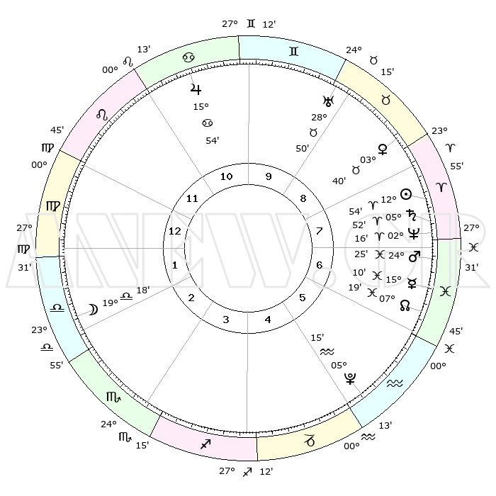 | | ΘΕΣΕΙΣ ΠΛΑΝΗΤΩΝ ΑΣΤΡΟΛΟΓΙΚΟΥ ΧΑΡΤΗ ΤΗΣ ΣΤΙΓΜΗΣ ΑΥΤΗΣ | | | | Πλανήτης | Ζώδιο | Μοίρες | Δεκαήμ. | Σε οίκο | Απόκλιση | | Ακμές των οίκων | | Ηλιος | Κριός | 12°50' | Δεύτερο | 8 | 05 N 04 | | 1ος | 07°30' | Παρθένος | | Σελήνη | Ζυγός | 18°27' | Δεύτερο | 2 | 10 S 18 | | 2ος | 02°08' | Ζυγός | | Ερμής | Ιχθείς | 15°06' | Δεύτερο | 7 | 07 S 17 | | 3ος | 01°24' | Σκορπιός | | Αφροδίτη | Ταύρος | 03°35' | Πρώτο | 9 | 12 N 21 | | 4ος | 04°22' | Τοξότης | | Αρης | Ιχθείς | 24°22' | Τρίτο | 7 | 03 S 12 | | 5ος | 08°05' | Αιγόκερως | | Δίας | Καρκίνος | 15°53' | Δεύτερο | 11 | 22 N 51 | | 6ος | 09°31' | Υδροχόος | | Κρόνος | Κριός | 05°51' | Πρώτο | 8 | 00 N 22 | | 7ος | 07°30' | Ιχθείς | | Ουρανός | Ταύρος | 28°50' | Τρίτο | 9 | 19 N 44 | | 8ος | 02°08' | Κριός | | Ποσειδώνας | Κριός | 02°16' | Πρώτο | 8 | 00 S 18 | | 9ος | 01°24' | Ταύρος | | Πλούτωνας | Υδροχόος | 05°15' | Πρώτο | 5 | 22 S 47 | | 10ος | 04°22' | Δίδυμοι | | Β. Δεσμός | Ιχθείς | 07°19' | Πρώτο | 6 | 08 S 49 | | 11ος | 08°05' | Καρκίνος | | Ωροσκόπος | Παρθένος | 07°30' | Πρώτο | | | 12ος | 09°31' | Λέων | | Μεσουράνημα | Δίδυμοι | 04°22' | Πρώτο | | | |