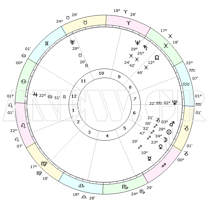 | | ΘΕΣΕΙΣ ΠΛΑΝΗΤΩΝ ΑΣΤΡΟΛΟΓΙΚΟΥ ΧΑΡΤΗ ΤΗΣ ΣΤΙΓΜΗΣ ΑΥΤΗΣ | | | | Πλανήτης | Ζώδιο | Μοίρες | Δεκαήμ. | Σε οίκο | Απόκλιση | | Ακμές των οίκων | | Ηλιος | Τοξότης | 27°27' | Τρίτο | 2 | 23 S 24 | | 1ος | 23°31' | Σκορπιός | | Σελήνη | Τοξότης | 17°02' | Δεύτερο | 1 | 27 S 46 | | 2ος | 23°50' | Τοξότης | | Ερμής | Τοξότης | 09°37' | Πρώτο | 1 | 20 S 53 | | 3ος | 28°30' | Αιγόκερως | | Αφροδίτη | Τοξότης | 23°01' | Τρίτο | 1 | 23 S 15 | | 4ος | 04°18' | Ιχθείς | | Αρης | Αιγόκερως | 02°53' | Πρώτο | 2 | 24 S 12 | | 5ος | 06°04' | Κριός | | Δίας | Καρκίνος | 22°55'R | Τρίτο | 8 | 21 N 41 | | 6ος | 01°59' | Ταύρος | | Κρόνος | Ιχθείς | 25°40' | Τρίτο | 4 | 03 S 50 | | 7ος | 23°31' | Ταύρος | | Ουρανός | Ταύρος | 28°21'R | Τρίτο | 7 | 19 N 35 | | 8ος | 23°50' | Δίδυμοι | | Ποσειδώνας | Ιχθείς | 29°24' | Τρίτο | 4 | 01 S 28 | | 9ος | 28°30' | Καρκίνος | | Πλούτωνας | Υδροχόος | 02°21' | Πρώτο | 3 | 23 S 18 | | 10ος | 04°18' | Παρθένος | | Β. Δεσμός | Ιχθείς | 12°51' | Δεύτερο | 4 | 06 S 44 | | 11ος | 06°04' | Ζυγός | | Ωροσκόπος | Σκορπιός | 23°31' | Τρίτο | | | 12ος | 01°59' | Σκορπιός | | Μεσουράνημα | Παρθένος | 04°18' | Πρώτο | | | |