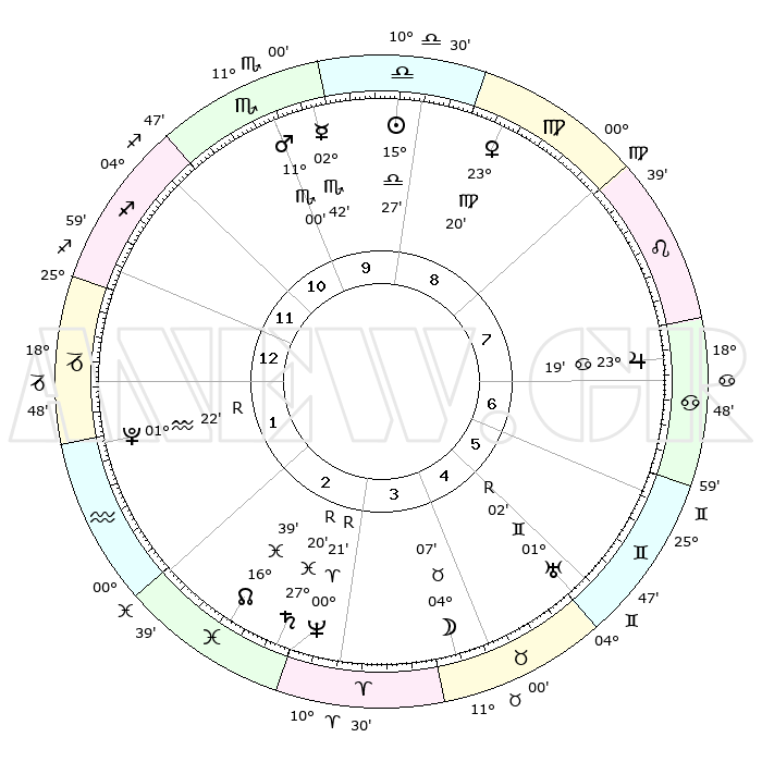 | ΘΕΣΕΙΣ ΠΛΑΝΗΤΩΝ ΑΣΤΡΟΛΟΓΙΚΟΥ ΧΑΡΤΗ ΤΗΣ ΣΤΙΓΜΗΣ ΑΥΤΗΣ | | Πλανήτης | Ζώδιο | Μοίρες | Δεκαήμ. | Σε οίκο | Απόκλιση | | Ακμές των οίκων | Ηλιος | Ζυγός | 15°22' | Δεύτερο | 10 | 06 S 03 | | 1ος | 19°08' | Τοξότης | Σελήνη | Ταύρος | 02°49' | Πρώτο | 4 | 15 N 53 | | 2ος | 23°42' | Αιγόκερως | Ερμής | Σκορπιός | 02°34' | Πρώτο | 10 | 13 S 17 | | 3ος | 02°31' | Ιχθείς | Αφροδίτη | Παρθένος | 23°13' | Τρίτο | 9 | 04 N 00 | | 4ος | 07°53' | Κριός | Αρης | Σκορπιός | 10°57' | Δεύτερο | 11 | 15 S 15 | | 5ος | 06°00' | Ταύρος | Δίας | Καρκίνος | 23°18' | Τρίτο | 7 | 21 N 27 | | 6ος | 28°43' | Ταύρος | Κρόνος | Ιχθείς | 27°21'R | Τρίτο | 3 | 03 S 22 | | 7ος | 19°08' | Δίδυμοι | Ουρανός | Δίδυμοι | 01°02'R | Πρώτο | 6 | 20 N 09 | | 8ος | 23°42' | Καρκίνος | Ποσειδώνας | Κριός | 00°21'R | Πρώτο | 3 | 01 S 07 | | 9ος | 02°31' | Παρθένος | Πλούτωνας | Υδροχόος | 01°22'R | Πρώτο | 2 | 23 S 32 | | 10ος | 07°53' | Ζυγός | Β. Δεσμός | Ιχθείς | 16°39' | Δεύτερο | 3 | 05 S 16 | | 11ος | 06°00' | Σκορπιός | Ωροσκόπος | Τοξότης | 19°08' | Δεύτερο | | | 12ος | 28°43' | Σκορπιός | Μεσουράνημα | Ζυγός | 07°53' | Πρώτο | | | |