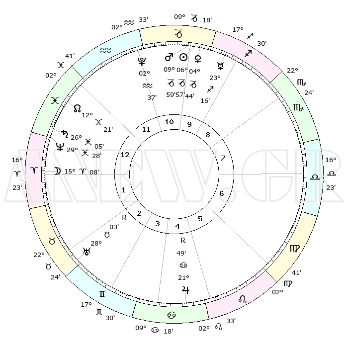 | | ΘΕΣΕΙΣ ΠΛΑΝΗΤΩΝ ΑΣΤΡΟΛΟΓΙΚΟΥ ΧΑΡΤΗ ΤΗΣ ΣΤΙΓΜΗΣ ΑΥΤΗΣ | | | | Πλανήτης | Ζώδιο | Μοίρες | Δεκαήμ. | Σε οίκο | Απόκλιση | | Ακμές των οίκων | | Ηλιος | Αιγόκερως | 06°53' | Πρώτο | 10 | 23 S 15 | | 1ος | 06°25' | Ιχθείς | | Σελήνη | Κριός | 14°11' | Δεύτερο | 1 | 08 N 08 | | 2ος | 21°11' | Κριός | | Ερμής | Τοξότης | 23°10' | Τρίτο | 10 | 23 S 25 | | 3ος | 22°39' | Ταύρος | | Αφροδίτη | Αιγόκερως | 04°39' | Πρώτο | 10 | 23 S 43 | | 4ος | 16°28' | Δίδυμοι | | Αρης | Αιγόκερως | 09°55' | Πρώτο | 11 | 23 S 56 | | 5ος | 08°10' | Καρκίνος | | Δίας | Καρκίνος | 21°49'R | Τρίτο | 5 | 21 N 54 | | 6ος | 02°25' | Λέων | | Κρόνος | Ιχθείς | 26°05' | Τρίτο | 1 | 03 S 38 | | 7ος | 06°25' | Παρθένος | | Ουρανός | Ταύρος | 28°03'R | Τρίτο | 3 | 19 N 32 | | 8ος | 21°11' | Ζυγός | | Ποσειδώνας | Ιχθείς | 29°28' | Τρίτο | 1 | 01 S 26 | | 9ος | 22°39' | Σκορπιός | | Πλούτωνας | Υδροχόος | 02°37' | Πρώτο | 12 | 23 S 15 | | 10ος | 16°28' | Τοξότης | | Β. Δεσμός | Ιχθείς | 12°22' | Δεύτερο | 1 | 06 S 55 | | 11ος | 08°10' | Αιγόκερως | | Ωροσκόπος | Ιχθείς | 06°25' | Πρώτο | | | 12ος | 02°25' | Υδροχόος | | Μεσουράνημα | Τοξότης | 16°28' | Δεύτερο | | | |