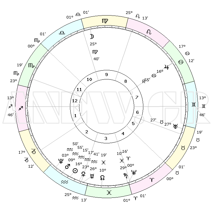 | | ΘΕΣΕΙΣ ΠΛΑΝΗΤΩΝ ΑΣΤΡΟΛΟΓΙΚΟΥ ΧΑΡΤΗ ΤΗΣ ΣΤΙΓΜΗΣ ΑΥΤΗΣ | | | | Πλανήτης | Ζώδιο | Μοίρες | Δεκαήμ. | Σε οίκο | Απόκλιση | | Ακμές των οίκων | | Ηλιος | Υδροχόος | 16°10' | Δεύτερο | 3 | 15 S 59 | | 1ος | 19°26' | Σκορπιός | | Σελήνη | Παρθένος | 24°35' | Τρίτο | 10 | 00 N 52 | | 2ος | 19°19' | Τοξότης | | Ερμής | Υδροχόος | 26°32' | Τρίτο | 3 | 14 S 08 | | 3ος | 23°24' | Αιγόκερως | | Αφροδίτη | Υδροχόος | 23°11' | Τρίτο | 3 | 15 S 07 | | 4ος | 28°58' | Υδροχόος | | Αρης | Υδροχόος | 09°51' | Πρώτο | 3 | 18 S 48 | | 5ος | 01°05' | Κριός | | Δίας | Καρκίνος | 16°56'R | Δεύτερο | 8 | 22 N 40 | | 6ος | 27°33' | Κριός | | Κρόνος | Ιχθείς | 29°09' | Τρίτο | 4 | 02 S 19 | | 7ος | 19°26' | Ταύρος | | Ουρανός | Ταύρος | 27°27' | Τρίτο | 7 | 19 N 24 | | 8ος | 19°19' | Δίδυμοι | | Ποσειδώνας | Κριός | 00°15' | Πρώτο | 4 | 01 S 06 | | 9ος | 23°24' | Καρκίνος | | Πλούτωνας | Υδροχόος | 03°50' | Πρώτο | 3 | 23 S 00 | | 10ος | 28°58' | Λέων | | Β. Δεσμός | Ιχθείς | 10°19' | Δεύτερο | 4 | 07 S 42 | | 11ος | 01°05' | Ζυγός | | Ωροσκόπος | Σκορπιός | 19°26' | Δεύτερο | | | 12ος | 27°33' | Ζυγός | | Μεσουράνημα | Λέων | 28°58' | Τρίτο | | | |
