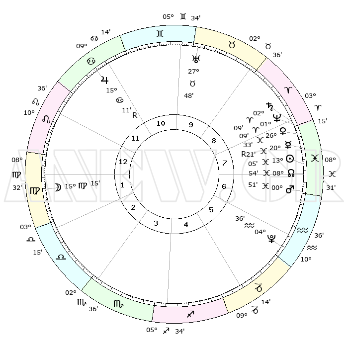 | | ΘΕΣΕΙΣ ΠΛΑΝΗΤΩΝ ΑΣΤΡΟΛΟΓΙΚΟΥ ΧΑΡΤΗ ΤΗΣ ΣΤΙΓΜΗΣ ΑΥΤΗΣ | | | | Πλανήτης | Ζώδιο | Μοίρες | Δεκαήμ. | Σε οίκο | Απόκλιση | | Ακμές των οίκων | | Ηλιος | Ιχθείς | 13°01' | Δεύτερο | 8 | 06 S 40 | | 1ος | 20°08' | Λέων | | Σελήνη | Παρθένος | 14°25' | Δεύτερο | 2 | 05 N 40 | | 2ος | 12°57' | Παρθένος | | Ερμής | Ιχθείς | 20°24'R | Τρίτο | 8 | 00 S 29 | | 3ος | 10°37' | Ζυγός | | Αφροδίτη | Ιχθείς | 26°28' | Τρίτο | 8 | 02 S 37 | | 4ος | 13°17' | Σκορπιός | | Αρης | Ιχθείς | 00°48' | Πρώτο | 7 | 12 S 13 | | 5ος | 18°12' | Τοξότης | | Δίας | Καρκίνος | 15°11'R | Δεύτερο | 11 | 22 N 55 | | 6ος | 21°04' | Αιγόκερως | | Κρόνος | Κριός | 02°09' | Πρώτο | 8 | 01 S 06 | | 7ος | 20°08' | Υδροχόος | | Ουρανός | Ταύρος | 27°47' | Τρίτο | 10 | 19 N 29 | | 8ος | 12°57' | Ιχθείς | | Ποσειδώνας | Κριός | 01°09' | Πρώτο | 8 | 00 S 45 | | 9ος | 10°37' | Κριός | | Πλούτωνας | Υδροχόος | 04°36' | Πρώτο | 6 | 22 S 52 | | 10ος | 13°17' | Ταύρος | | Β. Δεσμός | Ιχθείς | 08°54' | Πρώτο | 7 | 08 S 14 | | 11ος | 18°12' | Δίδυμοι | | Ωροσκόπος | Λέων | 20°08' | Τρίτο | | | 12ος | 21°04' | Καρκίνος | | Μεσουράνημα | Ταύρος | 13°17' | Δεύτερο | | | |