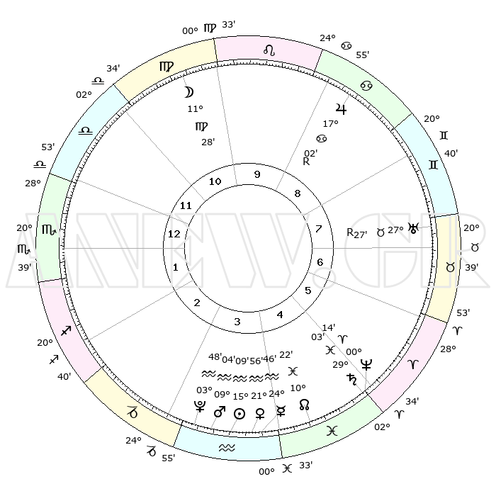 | | ΘΕΣΕΙΣ ΠΛΑΝΗΤΩΝ ΑΣΤΡΟΛΟΓΙΚΟΥ ΧΑΡΤΗ ΤΗΣ ΣΤΙΓΜΗΣ ΑΥΤΗΣ | | | | Πλανήτης | Ζώδιο | Μοίρες | Δεκαήμ. | Σε οίκο | Απόκλιση | | Ακμές των οίκων | | Ηλιος | Υδροχόος | 15°06' | Δεύτερο | 4 | 16 S 18 | | 1ος | 05°10' | Σκορπιός | | Σελήνη | Παρθένος | 10°45' | Δεύτερο | 10 | 07 N 23 | | 2ος | 03°54' | Τοξότης | | Ερμής | Υδροχόος | 24°41' | Τρίτο | 4 | 14 S 52 | | 3ος | 06°18' | Αιγόκερως | | Αφροδίτη | Υδροχόος | 21°52' | Τρίτο | 4 | 15 S 32 | | 4ος | 10°52' | Υδροχόος | | Αρης | Υδροχόος | 09°02' | Πρώτο | 3 | 19 S 00 | | 5ος | 13°41' | Ιχθείς | | Δίας | Καρκίνος | 17°02'R | Δεύτερο | 9 | 22 N 39 | | 6ος | 11°51' | Κριός | | Κρόνος | Ιχθείς | 29°03' | Τρίτο | 5 | 02 S 22 | | 7ος | 05°10' | Ταύρος | | Ουρανός | Ταύρος | 27°27'R | Τρίτο | 7 | 19 N 24 | | 8ος | 03°54' | Δίδυμοι | | Ποσειδώνας | Κριός | 00°14' | Πρώτο | 5 | 01 S 07 | | 9ος | 06°18' | Καρκίνος | | Πλούτωνας | Υδροχόος | 03°48' | Πρώτο | 3 | 23 S 00 | | 10ος | 10°52' | Λέων | | Β. Δεσμός | Ιχθείς | 10°22' | Δεύτερο | 4 | 07 S 41 | | 11ος | 13°41' | Παρθένος | | Ωροσκόπος | Σκορπιός | 05°10' | Πρώτο | | | 12ος | 11°51' | Ζυγός | | Μεσουράνημα | Λέων | 10°52' | Δεύτερο | | | |