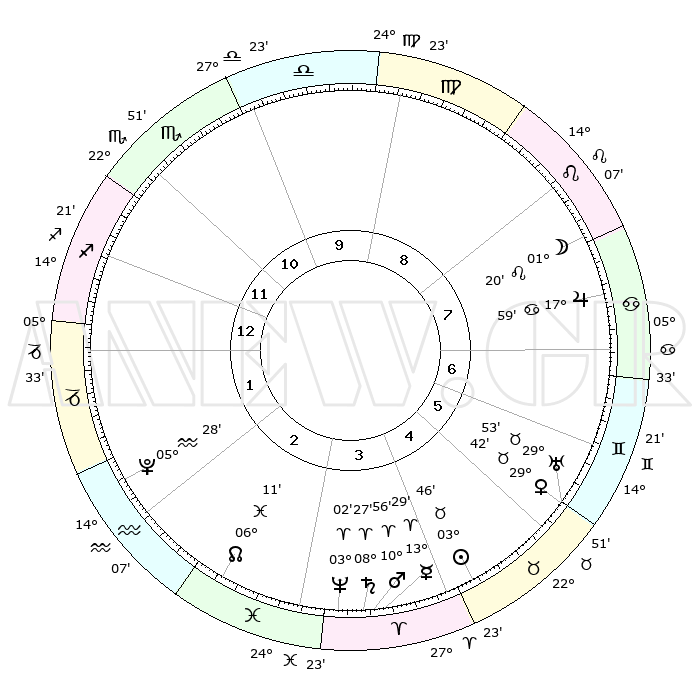 | | ΘΕΣΕΙΣ ΠΛΑΝΗΤΩΝ ΑΣΤΡΟΛΟΓΙΚΟΥ ΧΑΡΤΗ ΤΗΣ ΣΤΙΓΜΗΣ ΑΥΤΗΣ | | | | Πλανήτης | Ζώδιο | Μοίρες | Δεκαήμ. | Σε οίκο | Απόκλιση | | Ακμές των οίκων | | Ηλιος | Ταύρος | 03°42' | Πρώτο | 5 | 12 N 45 | | 1ος | 14°07' | Τοξότης | | Σελήνη | Λέων | 00°24' | Πρώτο | 8 | 23 N 03 | | 2ος | 17°38' | Αιγόκερως | | Ερμής | Κριός | 13°23' | Δεύτερο | 4 | 02 N 59 | | 3ος | 25°42' | Υδροχόος | | Αφροδίτη | Ταύρος | 29°37' | Τρίτο | 6 | 20 N 38 | | 4ος | 01°28' | Κριός | | Αρης | Κριός | 10°53' | Δεύτερο | 4 | 03 N 27 | | 5ος | 00°25' | Ταύρος | | Δίας | Καρκίνος | 17°58' | Δεύτερο | 8 | 22 N 37 | | 6ος | 23°40' | Ταύρος | | Κρόνος | Κριός | 08°26' | Πρώτο | 4 | 01 N 22 | | 7ος | 14°07' | Δίδυμοι | | Ουρανός | Ταύρος | 29°53' | Τρίτο | 6 | 19 N 57 | | 8ος | 17°38' | Καρκίνος | | Ποσειδώνας | Κριός | 03°02' | Πρώτο | 4 | 00 S 00 | | 9ος | 25°42' | Λέων | | Πλούτωνας | Υδροχόος | 05°28' | Πρώτο | 2 | 22 S 48 | | 10ος | 01°28' | Ζυγός | | Β. Δεσμός | Ιχθείς | 06°12' | Πρώτο | 3 | 09 S 14 | | 11ος | 00°25' | Σκορπιός | | Ωροσκόπος | Τοξότης | 14°07' | Δεύτερο | | | 12ος | 23°40' | Σκορπιός | | Μεσουράνημα | Ζυγός | 01°28' | Πρώτο | | | |