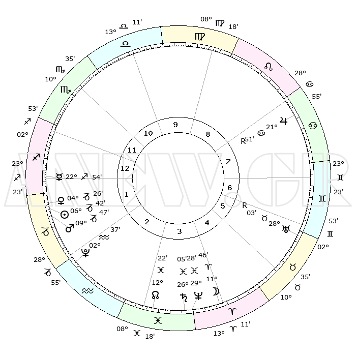| | ΘΕΣΕΙΣ ΠΛΑΝΗΤΩΝ ΑΣΤΡΟΛΟΓΙΚΟΥ ΧΑΡΤΗ ΤΗΣ ΣΤΙΓΜΗΣ ΑΥΤΗΣ | | | | Πλανήτης | Ζώδιο | Μοίρες | Δεκαήμ. | Σε οίκο | Απόκλιση | | Ακμές των οίκων | | Ηλιος | Αιγόκερως | 06°37' | Πρώτο | 2 | 23 S 16 | | 1ος | 00°53' | Τοξότης | | Σελήνη | Κριός | 10°44' | Δεύτερο | 4 | 06 N 33 | | 2ος | 02°08' | Αιγόκερως | | Ερμής | Τοξότης | 22°48' | Τρίτο | 1 | 23 S 22 | | 3ος | 07°59' | Υδροχόος | | Αφροδίτη | Αιγόκερως | 04°20' | Πρώτο | 2 | 23 S 43 | | 4ος | 14°03' | Ιχθείς | | Αρης | Αιγόκερως | 09°44' | Πρώτο | 2 | 23 S 56 | | 5ος | 14°58' | Κριός | | Δίας | Καρκίνος | 21°51'R | Τρίτο | 8 | 21 N 53 | | 6ος | 09°54' | Ταύρος | | Κρόνος | Ιχθείς | 26°04' | Τρίτο | 4 | 03 S 39 | | 7ος | 00°53' | Δίδυμοι | | Ουρανός | Ταύρος | 28°03'R | Τρίτο | 6 | 19 N 32 | | 8ος | 02°08' | Καρκίνος | | Ποσειδώνας | Ιχθείς | 29°28' | Τρίτο | 4 | 01 S 26 | | 9ος | 07°59' | Λέων | | Πλούτωνας | Υδροχόος | 02°36' | Πρώτο | 2 | 23 S 15 | | 10ος | 14°03' | Παρθένος | | Β. Δεσμός | Ιχθείς | 12°22' | Δεύτερο | 3 | 06 S 55 | | 11ος | 14°58' | Ζυγός | | Ωροσκόπος | Τοξότης | 00°53' | Πρώτο | | | 12ος | 09°54' | Σκορπιός | | Μεσουράνημα | Παρθένος | 14°03' | Δεύτερο | | | |