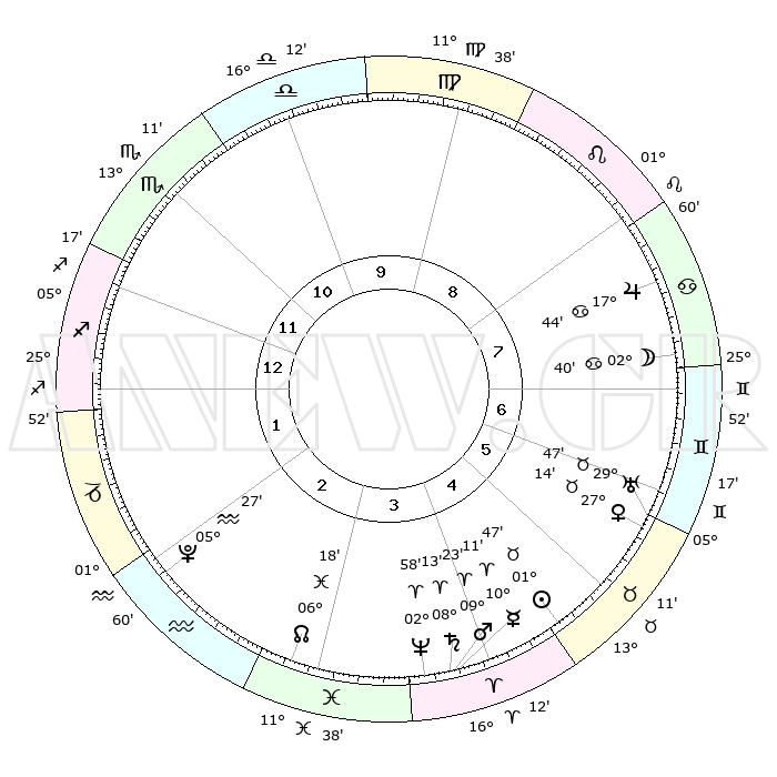 | | ΘΕΣΕΙΣ ΠΛΑΝΗΤΩΝ ΑΣΤΡΟΛΟΓΙΚΟΥ ΧΑΡΤΗ ΤΗΣ ΣΤΙΓΜΗΣ ΑΥΤΗΣ | | | | Πλανήτης | Ζώδιο | Μοίρες | Δεκαήμ. | Σε οίκο | Απόκλιση | | Ακμές των οίκων | | Ηλιος | Ταύρος | 01°43' | Πρώτο | 5 | 12 N 04 | | 1ος | 04°11' | Τοξότης | | Σελήνη | Καρκίνος | 01°38' | Πρώτο | 7 | 28 N 05 | | 2ος | 05°55' | Αιγόκερως | | Ερμής | Κριός | 10°04' | Δεύτερο | 4 | 01 N 37 | | 3ος | 12°19' | Υδροχόος | | Αφροδίτη | Ταύρος | 27°09' | Τρίτο | 6 | 19 N 59 | | 4ος | 18°25' | Ιχθείς | | Αρης | Κριός | 09°19' | Πρώτο | 4 | 02 N 49 | | 5ος | 18°54' | Κριός | | Δίας | Καρκίνος | 17°44' | Δεύτερο | 8 | 22 N 38 | | 6ος | 13°23' | Ταύρος | | Κρόνος | Κριός | 08°12' | Πρώτο | 4 | 01 N 16 | | 7ος | 04°11' | Δίδυμοι | | Ουρανός | Ταύρος | 29°47' | Τρίτο | 6 | 19 N 56 | | 8ος | 05°55' | Καρκίνος | | Ποσειδώνας | Κριός | 02°58' | Πρώτο | 4 | 00 S 02 | | 9ος | 12°19' | Λέων | | Πλούτωνας | Υδροχόος | 05°27' | Πρώτο | 2 | 22 S 48 | | 10ος | 18°25' | Παρθένος | | Β. Δεσμός | Ιχθείς | 06°18' | Πρώτο | 3 | 09 S 12 | | 11ος | 18°54' | Ζυγός | | Ωροσκόπος | Τοξότης | 04°11' | Πρώτο | | | 12ος | 13°23' | Σκορπιός | | Μεσουράνημα | Παρθένος | 18°25' | Δεύτερο | | | |