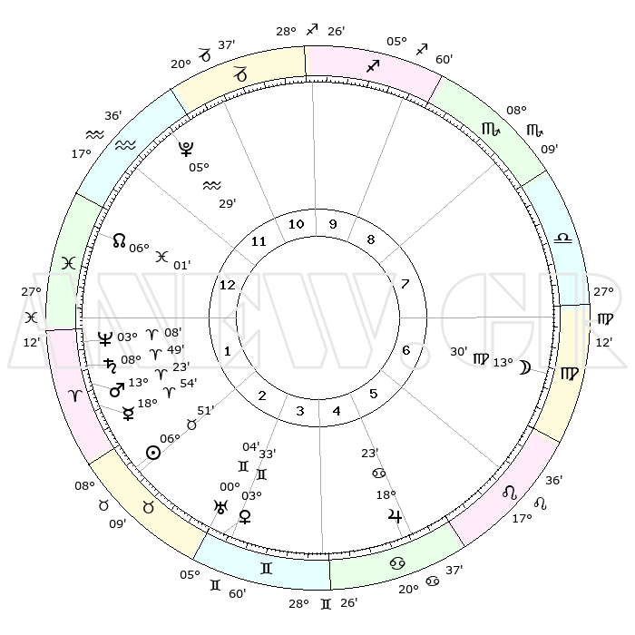 | | ΘΕΣΕΙΣ ΠΛΑΝΗΤΩΝ ΑΣΤΡΟΛΟΓΙΚΟΥ ΧΑΡΤΗ ΤΗΣ ΣΤΙΓΜΗΣ ΑΥΤΗΣ | | | | Πλανήτης | Ζώδιο | Μοίρες | Δεκαήμ. | Σε οίκο | Απόκλιση | | Ακμές των οίκων | | Ηλιος | Ταύρος | 06°47' | Πρώτο | 2 | 13 N 46 | | 1ος | 18°42' | Υδροχόος | | Σελήνη | Παρθένος | 12°36' | Δεύτερο | 7 | 06 N 24 | | 2ος | 04°31' | Κριός | | Ερμής | Κριός | 18°46' | Δεύτερο | 2 | 05 N 14 | | 3ος | 09°29' | Ταύρος | | Αφροδίτη | Δίδυμοι | 03°28' | Πρώτο | 3 | 21 N 33 | | 4ος | 05°09' | Δίδυμοι | | Αρης | Κριός | 13°19' | Δεύτερο | 2 | 04 N 25 | | 5ος | 27°00' | Δίδυμοι | | Δίας | Καρκίνος | 18°23' | Δεύτερο | 5 | 22 N 33 | | 6ος | 19°32' | Καρκίνος | | Κρόνος | Κριός | 08°48' | Πρώτο | 2 | 01 N 30 | | 7ος | 18°42' | Λέων | | Ουρανός | Δίδυμοι | 00°03' | Πρώτο | 3 | 20 N 00 | | 8ος | 04°31' | Ζυγός | | Ποσειδώνας | Κριός | 03°08' | Πρώτο | 1 | 00 N 02 | | 9ος | 09°29' | Σκορπιός | | Πλούτωνας | Υδροχόος | 05°29' | Πρώτο | 12 | 22 S 48 | | 10ος | 05°09' | Τοξότης | | Β. Δεσμός | Ιχθείς | 06°02' | Πρώτο | 1 | 09 S 18 | | 11ος | 27°00' | Τοξότης | | Ωροσκόπος | Υδροχόος | 18°42' | Δεύτερο | | | 12ος | 19°32' | Αιγόκερως | | Μεσουράνημα | Τοξότης | 05°09' | Πρώτο | | | |