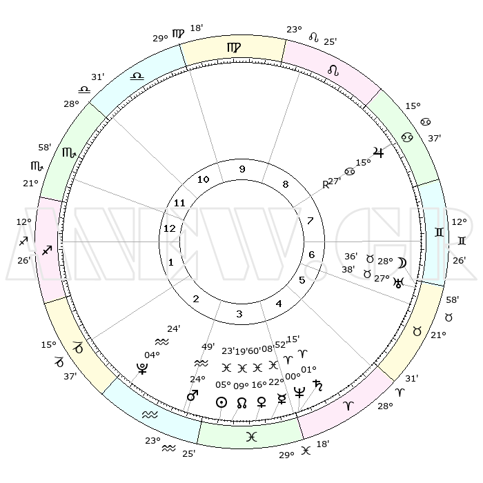 | | ΘΕΣΕΙΣ ΠΛΑΝΗΤΩΝ ΑΣΤΡΟΛΟΓΙΚΟΥ ΧΑΡΤΗ ΤΗΣ ΣΤΙΓΜΗΣ ΑΥΤΗΣ | | | | Πλανήτης | Ζώδιο | Μοίρες | Δεκαήμ. | Σε οίκο | Απόκλιση | | Ακμές των οίκων | | Ηλιος | Ιχθείς | 05°20' | Πρώτο | 4 | 09 S 33 | | 1ος | 24°00' | Σκορπιός | | Σελήνη | Ταύρος | 27°42' | Τρίτο | 7 | 24 N 41 | | 2ος | 24°23' | Τοξότης | | Ερμής | Ιχθείς | 22°07' | Τρίτο | 4 | 01 S 04 | | 3ος | 29°07' | Αιγόκερως | | Αφροδίτη | Ιχθείς | 16°55' | Δεύτερο | 4 | 06 S 29 | | 4ος | 04°57' | Ιχθείς | | Αρης | Υδροχόος | 24°46' | Τρίτο | 3 | 14 S 17 | | 5ος | 06°39' | Κριός | | Δίας | Καρκίνος | 15°28'R | Δεύτερο | 8 | 22 N 52 | | 6ος | 02°31' | Ταύρος | | Κρόνος | Κριός | 01°15' | Πρώτο | 4 | 01 S 28 | | 7ος | 24°00' | Ταύρος | | Ουρανός | Ταύρος | 27°38' | Τρίτο | 7 | 19 N 27 | | 8ος | 24°23' | Δίδυμοι | | Ποσειδώνας | Κριός | 00°52' | Πρώτο | 4 | 00 S 51 | | 9ος | 29°07' | Καρκίνος | | Πλούτωνας | Υδροχόος | 04°24' | Πρώτο | 3 | 22 S 54 | | 10ος | 04°57' | Παρθένος | | Β. Δεσμός | Ιχθείς | 09°19' | Πρώτο | 4 | 08 S 05 | | 11ος | 06°39' | Ζυγός | | Ωροσκόπος | Σκορπιός | 24°00' | Τρίτο | | | 12ος | 02°31' | Σκορπιός | | Μεσουράνημα | Παρθένος | 04°57' | Πρώτο | | | |