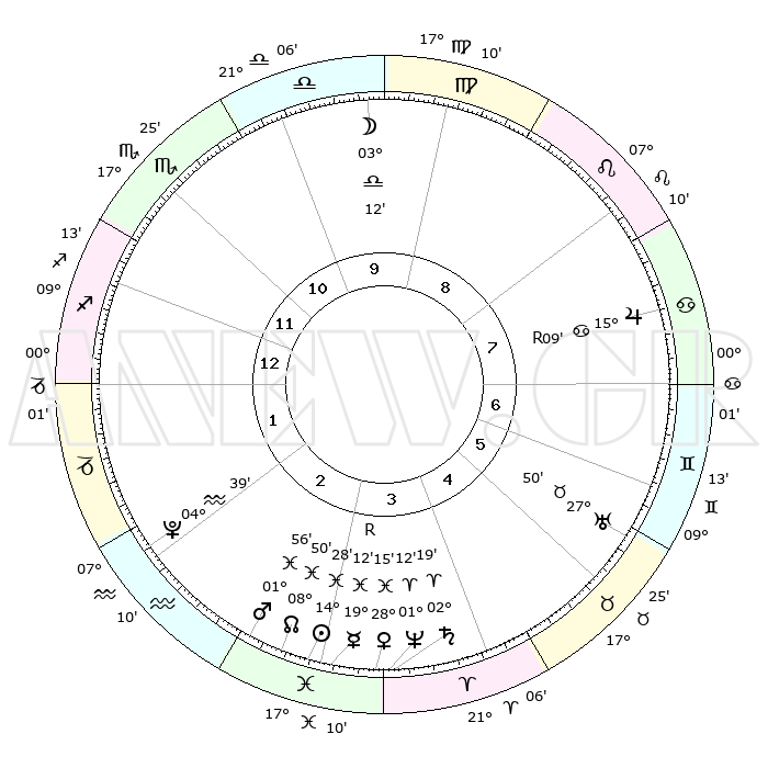 | | ΘΕΣΕΙΣ ΠΛΑΝΗΤΩΝ ΑΣΤΡΟΛΟΓΙΚΟΥ ΧΑΡΤΗ ΤΗΣ ΣΤΙΓΜΗΣ ΑΥΤΗΣ | | | | Πλανήτης | Ζώδιο | Μοίρες | Δεκαήμ. | Σε οίκο | Απόκλιση | | Ακμές των οίκων | | Ηλιος | Ιχθείς | 14°23' | Δεύτερο | 3 | 06 S 09 | | 1ος | 07°56' | Τοξότης | | Σελήνη | Ζυγός | 02°17' | Πρώτο | 10 | 02 S 50 | | 2ος | 10°18' | Αιγόκερως | | Ερμής | Ιχθείς | 19°16'R | Δεύτερο | 3 | 00 S 52 | | 3ος | 17°20' | Υδροχόος | | Αφροδίτη | Ιχθείς | 28°10' | Τρίτο | 4 | 01 S 55 | | 4ος | 23°24' | Ιχθείς | | Αρης | Ιχθείς | 01°53' | Πρώτο | 3 | 11 S 50 | | 5ος | 23°19' | Κριός | | Δίας | Καρκίνος | 15°09'R | Δεύτερο | 8 | 22 N 55 | | 6ος | 17°19' | Ταύρος | | Κρόνος | Κριός | 02°19' | Πρώτο | 4 | 01 S 02 | | 7ος | 07°56' | Δίδυμοι | | Ουρανός | Ταύρος | 27°50' | Τρίτο | 6 | 19 N 30 | | 8ος | 10°18' | Καρκίνος | | Ποσειδώνας | Κριός | 01°12' | Πρώτο | 4 | 00 S 43 | | 9ος | 17°20' | Λέων | | Πλούτωνας | Υδροχόος | 04°38' | Πρώτο | 2 | 22 S 51 | | 10ος | 23°24' | Παρθένος | | Β. Δεσμός | Ιχθείς | 08°50' | Πρώτο | 3 | 08 S 15 | | 11ος | 23°19' | Ζυγός | | Ωροσκόπος | Τοξότης | 07°56' | Πρώτο | | | 12ος | 17°19' | Σκορπιός | | Μεσουράνημα | Παρθένος | 23°24' | Τρίτο | | | |
