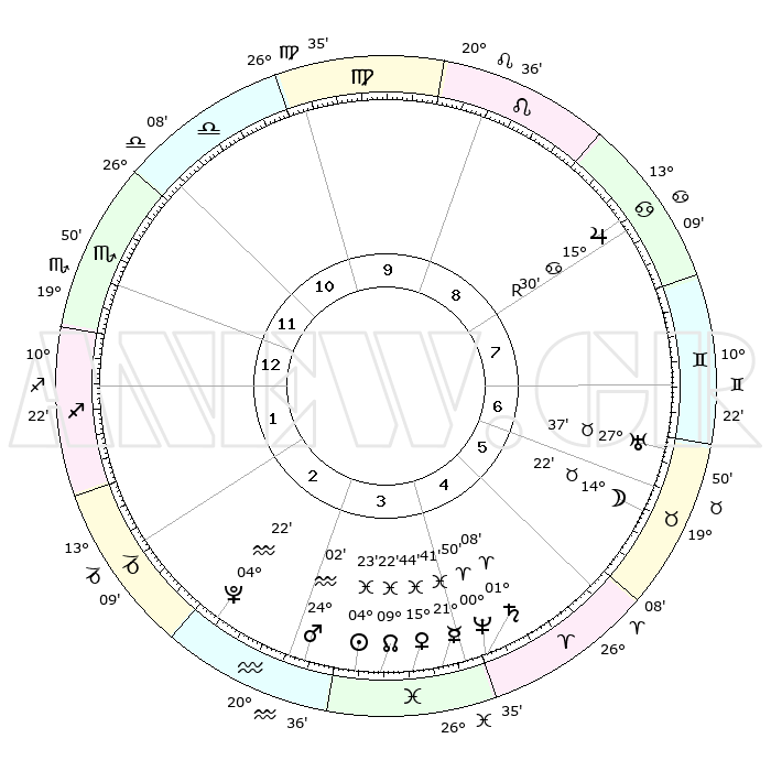 | | ΘΕΣΕΙΣ ΠΛΑΝΗΤΩΝ ΑΣΤΡΟΛΟΓΙΚΟΥ ΧΑΡΤΗ ΤΗΣ ΣΤΙΓΜΗΣ ΑΥΤΗΣ | | | | Πλανήτης | Ζώδιο | Μοίρες | Δεκαήμ. | Σε οίκο | Απόκλιση | | Ακμές των οίκων | | Ηλιος | Ιχθείς | 04°18' | Πρώτο | 4 | 09 S 56 | | 1ος | 19°11' | Σκορπιός | | Σελήνη | Ταύρος | 13°21' | Δεύτερο | 6 | 20 N 23 | | 2ος | 19°03' | Τοξότης | | Ερμής | Ιχθείς | 21°39' | Τρίτο | 4 | 01 S 29 | | 3ος | 23°05' | Αιγόκερως | | Αφροδίτη | Ιχθείς | 15°39' | Δεύτερο | 4 | 06 S 59 | | 4ος | 28°39' | Υδροχόος | | Αρης | Υδροχόος | 23°58' | Τρίτο | 3 | 14 S 33 | | 5ος | 00°47' | Κριός | | Δίας | Καρκίνος | 15°31'R | Δεύτερο | 8 | 22 N 52 | | 6ος | 27°17' | Κριός | | Κρόνος | Κριός | 01°07' | Πρώτο | 5 | 01 S 31 | | 7ος | 19°11' | Ταύρος | | Ουρανός | Ταύρος | 27°37' | Τρίτο | 7 | 19 N 27 | | 8ος | 19°03' | Δίδυμοι | | Ποσειδώνας | Κριός | 00°50' | Πρώτο | 5 | 00 S 52 | | 9ος | 23°05' | Καρκίνος | | Πλούτωνας | Υδροχόος | 04°22' | Πρώτο | 3 | 22 S 54 | | 10ος | 28°39' | Λέων | | Β. Δεσμός | Ιχθείς | 09°22' | Πρώτο | 4 | 08 S 03 | | 11ος | 00°47' | Ζυγός | | Ωροσκόπος | Σκορπιός | 19°11' | Δεύτερο | | | 12ος | 27°17' | Ζυγός | | Μεσουράνημα | Λέων | 28°39' | Τρίτο | | | |
