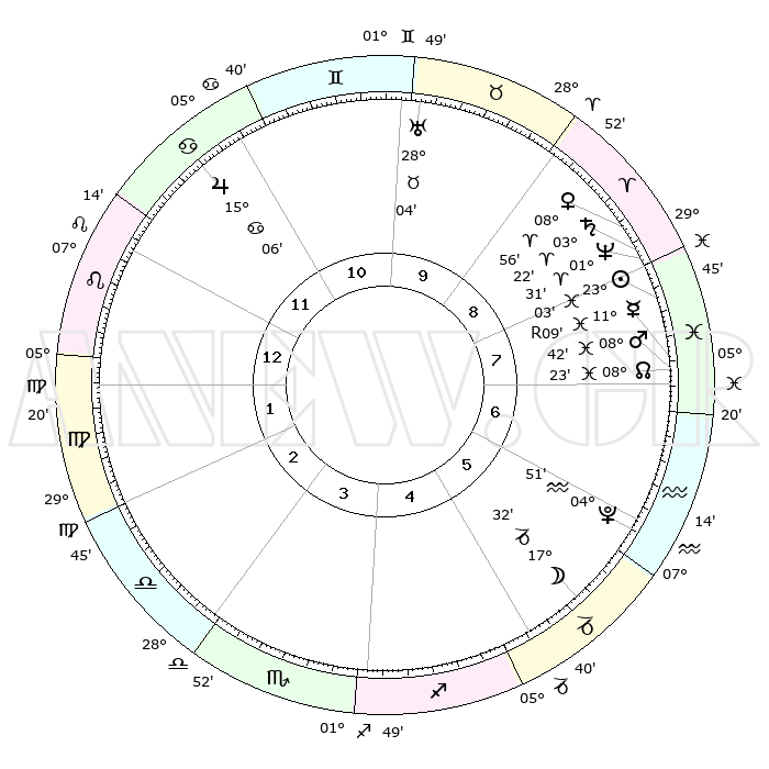 | | ΘΕΣΕΙΣ ΠΛΑΝΗΤΩΝ ΑΣΤΡΟΛΟΓΙΚΟΥ ΧΑΡΤΗ ΤΗΣ ΣΤΙΓΜΗΣ ΑΥΤΗΣ | | | | Πλανήτης | Ζώδιο | Μοίρες | Δεκαήμ. | Σε οίκο | Απόκλιση | | Ακμές των οίκων | | Ηλιος | Ιχθείς | 22°60' | Τρίτο | 8 | 02 S 47 | | 1ος | 20°24' | Λέων | | Σελήνη | Αιγόκερως | 16°54' | Δεύτερο | 5 | 26 S 29 | | 2ος | 13°15' | Παρθένος | | Ερμής | Ιχθείς | 11°12'R | Δεύτερο | 7 | 04 S 50 | | 3ος | 10°56' | Ζυγός | | Αφροδίτη | Κριός | 08°52' | Πρώτο | 8 | 02 N 31 | | 4ος | 13°37' | Σκορπιός | | Αρης | Ιχθείς | 08°39' | Πρώτο | 7 | 09 S 20 | | 5ος | 18°30' | Τοξότης | | Δίας | Καρκίνος | 15°06' | Δεύτερο | 11 | 22 N 56 | | 6ος | 21°21' | Αιγόκερως | | Κρόνος | Κριός | 03°22' | Πρώτο | 8 | 00 S 37 | | 7ος | 20°24' | Υδροχόος | | Ουρανός | Ταύρος | 28°04' | Τρίτο | 10 | 19 N 33 | | 8ος | 13°15' | Ιχθείς | | Ποσειδώνας | Κριός | 01°31' | Πρώτο | 8 | 00 S 36 | | 9ος | 10°56' | Κριός | | Πλούτωνας | Υδροχόος | 04°51' | Πρώτο | 6 | 22 S 50 | | 10ος | 13°37' | Ταύρος | | Β. Δεσμός | Ιχθείς | 08°23' | Πρώτο | 7 | 08 S 26 | | 11ος | 18°30' | Δίδυμοι | | Ωροσκόπος | Λέων | 20°24' | Τρίτο | | | 12ος | 21°21' | Καρκίνος | | Μεσουράνημα | Ταύρος | 13°37' | Δεύτερο | | | |