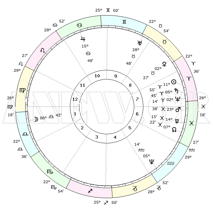 | | ΘΕΣΕΙΣ ΠΛΑΝΗΤΩΝ ΑΣΤΡΟΛΟΓΙΚΟΥ ΧΑΡΤΗ ΤΗΣ ΣΤΙΓΜΗΣ ΑΥΤΗΣ | | | | Πλανήτης | Ζώδιο | Μοίρες | Δεκαήμ. | Σε οίκο | Απόκλιση | | Ακμές των οίκων | | Ηλιος | Κριός | 11°51' | Δεύτερο | 8 | 04 N 41 | | 1ος | 07°31' | Παρθένος | | Σελήνη | Ζυγός | 05°53' | Πρώτο | 2 | 04 S 31 | | 2ος | 02°08' | Ζυγός | | Ερμής | Ιχθείς | 14°12' | Δεύτερο | 7 | 07 S 30 | | 3ος | 01°25' | Σκορπιός | | Αφροδίτη | Ταύρος | 02°22' | Πρώτο | 9 | 11 N 54 | | 4ος | 04°23' | Τοξότης | | Αρης | Ιχθείς | 23°35' | Τρίτο | 7 | 03 S 30 | | 5ος | 08°06' | Αιγόκερως | | Δίας | Καρκίνος | 15°49' | Δεύτερο | 11 | 22 N 52 | | 6ος | 09°32' | Υδροχόος | | Κρόνος | Κριός | 05°44' | Πρώτο | 8 | 00 N 19 | | 7ος | 07°31' | Ιχθείς | | Ουρανός | Ταύρος | 28°47' | Τρίτο | 9 | 19 N 43 | | 8ος | 02°08' | Κριός | | Ποσειδώνας | Κριός | 02°14' | Πρώτο | 8 | 00 S 19 | | 9ος | 01°25' | Ταύρος | | Πλούτωνας | Υδροχόος | 05°14' | Πρώτο | 5 | 22 S 47 | | 10ος | 04°23' | Δίδυμοι | | Β. Δεσμός | Ιχθείς | 07°22' | Πρώτο | 6 | 08 S 48 | | 11ος | 08°06' | Καρκίνος | | Ωροσκόπος | Παρθένος | 07°31' | Πρώτο | | | 12ος | 09°32' | Λέων | | Μεσουράνημα | Δίδυμοι | 04°23' | Πρώτο | | | |
