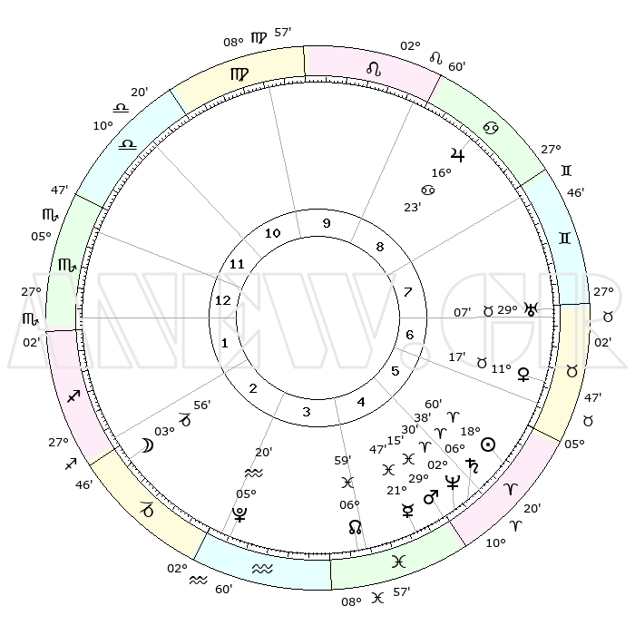 | | ΘΕΣΕΙΣ ΠΛΑΝΗΤΩΝ ΑΣΤΡΟΛΟΓΙΚΟΥ ΧΑΡΤΗ ΤΗΣ ΣΤΙΓΜΗΣ ΑΥΤΗΣ | | | | Πλανήτης | Ζώδιο | Μοίρες | Δεκαήμ. | Σε οίκο | Απόκλιση | | Ακμές των οίκων | | Ηλιος | Κριός | 18°56' | Δεύτερο | 6 | 07 N 25 | | 1ος | 06°06' | Σκορπιός | | Σελήνη | Αιγόκερως | 03°04' | Πρώτο | 2 | 28 S 05 | | 2ος | 04°54' | Τοξότης | | Ερμής | Ιχθείς | 21°42' | Τρίτο | 5 | 05 S 21 | | 3ος | 07°24' | Αιγόκερως | | Αφροδίτη | Ταύρος | 11°11' | Δεύτερο | 7 | 15 N 05 | | 4ος | 12°01' | Υδροχόος | | Αρης | Ιχθείς | 29°11' | Τρίτο | 5 | 01 S 15 | | 5ος | 14°49' | Ιχθείς | | Δίας | Καρκίνος | 16°22' | Δεύτερο | 9 | 22 N 48 | | 6ος | 12°53' | Κριός | | Κρόνος | Κριός | 06°37' | Πρώτο | 5 | 00 N 40 | | 7ος | 06°06' | Ταύρος | | Ουρανός | Ταύρος | 29°07' | Τρίτο | 7 | 19 N 47 | | 8ος | 04°54' | Δίδυμοι | | Ποσειδώνας | Κριός | 02°30' | Πρώτο | 5 | 00 S 13 | | 9ος | 07°24' | Καρκίνος | | Πλούτωνας | Υδροχόος | 05°20' | Πρώτο | 3 | 22 S 47 | | 10ος | 12°01' | Λέων | | Β. Δεσμός | Ιχθείς | 06°60' | Πρώτο | 4 | 08 S 57 | | 11ος | 14°49' | Παρθένος | | Ωροσκόπος | Σκορπιός | 06°06' | Πρώτο | | | 12ος | 12°53' | Ζυγός | | Μεσουράνημα | Λέων | 12°01' | Δεύτερο | | | |