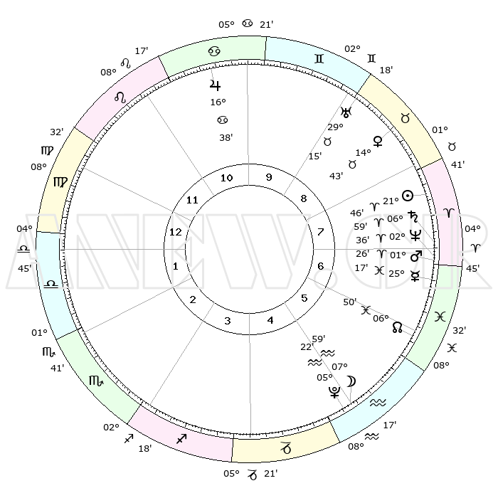 | | ΘΕΣΕΙΣ ΠΛΑΝΗΤΩΝ ΑΣΤΡΟΛΟΓΙΚΟΥ ΧΑΡΤΗ ΤΗΣ ΣΤΙΓΜΗΣ ΑΥΤΗΣ | | | | Πλανήτης | Ζώδιο | Μοίρες | Δεκαήμ. | Σε οίκο | Απόκλιση | | Ακμές των οίκων | | Ηλιος | Κριός | 21°42' | Τρίτο | 8 | 08 N 27 | | 1ος | 17°09' | Παρθένος | | Σελήνη | Υδροχόος | 07°15' | Πρώτο | 5 | 21 S 01 | | 2ος | 12°42' | Ζυγός | | Ερμής | Ιχθείς | 25°12' | Τρίτο | 7 | 04 S 09 | | 3ος | 12°34' | Σκορπιός | | Αφροδίτη | Ταύρος | 14°39' | Δεύτερο | 9 | 16 N 15 | | 4ος | 15°30' | Τοξότης | | Αρης | Κριός | 01°23' | Πρώτο | 7 | 00 S 22 | | 5ος | 18°47' | Αιγόκερως | | Δίας | Καρκίνος | 16°38' | Δεύτερο | 10 | 22 N 46 | | 6ος | 19°44' | Υδροχόος | | Κρόνος | Κριός | 06°58' | Πρώτο | 7 | 00 N 48 | | 7ος | 17°09' | Ιχθείς | | Ουρανός | Ταύρος | 29°15' | Τρίτο | 9 | 19 N 49 | | 8ος | 12°42' | Κριός | | Ποσειδώνας | Κριός | 02°36' | Πρώτο | 7 | 00 S 10 | | 9ος | 12°34' | Ταύρος | | Πλούτωνας | Υδροχόος | 05°22' | Πρώτο | 5 | 22 S 47 | | 10ος | 15°30' | Δίδυμοι | | Β. Δεσμός | Ιχθείς | 06°51' | Πρώτο | 6 | 09 S 00 | | 11ος | 18°47' | Καρκίνος | | Ωροσκόπος | Παρθένος | 17°09' | Δεύτερο | | | 12ος | 19°44' | Λέων | | Μεσουράνημα | Δίδυμοι | 15°30' | Δεύτερο | | | |