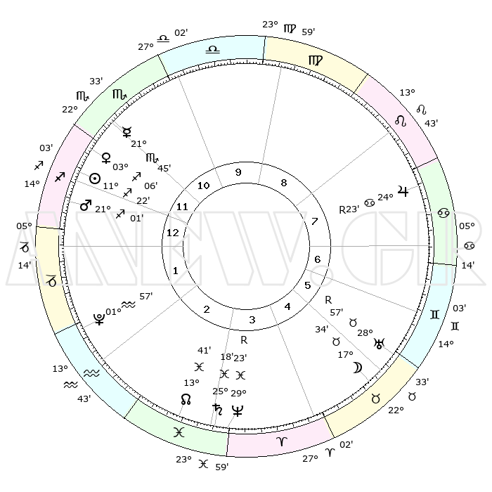 | | ΘΕΣΕΙΣ ΠΛΑΝΗΤΩΝ ΑΣΤΡΟΛΟΓΙΚΟΥ ΧΑΡΤΗ ΤΗΣ ΣΤΙΓΜΗΣ ΑΥΤΗΣ | | | | Πλανήτης | Ζώδιο | Μοίρες | Δεκαήμ. | Σε οίκο | Απόκλιση | | Ακμές των οίκων | | Ηλιος | Τοξότης | 11°21' | Δεύτερο | 12 | 22 S 08 | | 1ος | 26°26' | Τοξότης | | Σελήνη | Ταύρος | 17°10' | Δεύτερο | 5 | 21 N 14 | | 2ος | 02°42' | Υδροχόος | | Ερμής | Σκορπιός | 21°44' | Τρίτο | 11 | 15 S 41 | | 3ος | 12°24' | Ιχθείς | | Αφροδίτη | Τοξότης | 03°04' | Πρώτο | 11 | 20 S 09 | | 4ος | 16°53' | Κριός | | Αρης | Τοξότης | 20°60' | Τρίτο | 12 | 23 S 48 | | 5ος | 13°47' | Ταύρος | | Δίας | Καρκίνος | 24°23'R | Τρίτο | 7 | 21 N 24 | | 6ος | 05°50' | Δίδυμοι | | Κρόνος | Ιχθείς | 25°18' | Τρίτο | 3 | 04 S 02 | | 7ος | 26°26' | Δίδυμοι | | Ουρανός | Ταύρος | 28°57'R | Τρίτο | 5 | 19 N 43 | | 8ος | 02°42' | Λέων | | Ποσειδώνας | Ιχθείς | 29°23'R | Τρίτο | 3 | 01 S 29 | | 9ος | 12°24' | Παρθένος | | Πλούτωνας | Υδροχόος | 01°57' | Πρώτο | 1 | 23 S 23 | | 10ος | 16°53' | Ζυγός | | Β. Δεσμός | Ιχθείς | 13°41' | Δεύτερο | 3 | 06 S 25 | | 11ος | 13°47' | Σκορπιός | | Ωροσκόπος | Τοξότης | 26°26' | Τρίτο | | | 12ος | 05°50' | Τοξότης | | Μεσουράνημα | Ζυγός | 16°53' | Δεύτερο | | | |