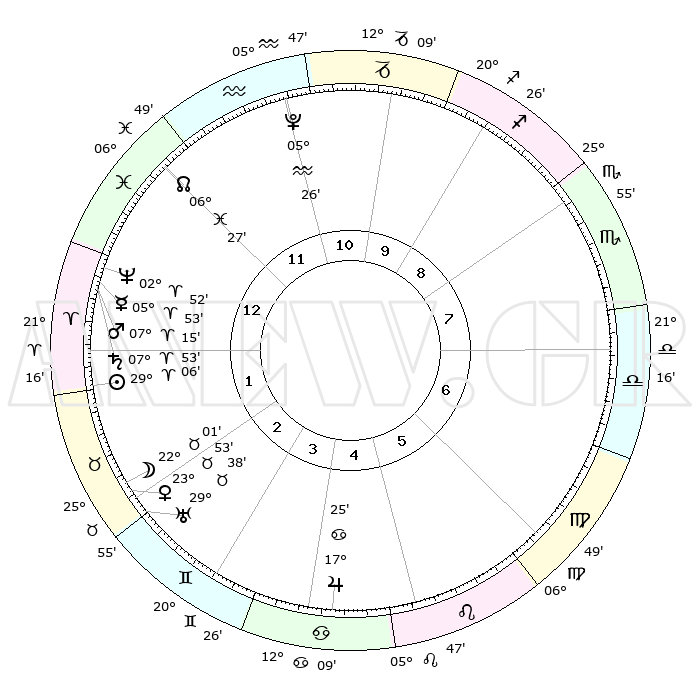 | | ΘΕΣΕΙΣ ΠΛΑΝΗΤΩΝ ΑΣΤΡΟΛΟΓΙΚΟΥ ΧΑΡΤΗ ΤΗΣ ΣΤΙΓΜΗΣ ΑΥΤΗΣ | | | | Πλανήτης | Ζώδιο | Μοίρες | Δεκαήμ. | Σε οίκο | Απόκλιση | | Ακμές των οίκων | | Ηλιος | Κριός | 29°02' | Τρίτο | 2 | 11 N 08 | | 1ος | 08°07' | Ιχθείς | | Σελήνη | Ταύρος | 20°54' | Τρίτο | 2 | 22 N 41 | | 2ος | 22°40' | Κριός | | Ερμής | Κριός | 05°46' | Πρώτο | 1 | 00 S 08 | | 3ος | 23°49' | Ταύρος | | Αφροδίτη | Ταύρος | 23°48' | Τρίτο | 2 | 19 N 04 | | 4ος | 17°29' | Δίδυμοι | | Αρης | Κριός | 07°12' | Πρώτο | 1 | 01 N 58 | | 5ος | 09°11' | Καρκίνος | | Δίας | Καρκίνος | 17°24' | Δεύτερο | 5 | 22 N 41 | | 6ος | 03°38' | Λέων | | Κρόνος | Κριός | 07°52' | Πρώτο | 1 | 01 N 09 | | 7ος | 08°07' | Παρθένος | | Ουρανός | Ταύρος | 29°38' | Τρίτο | 3 | 19 N 54 | | 8ος | 22°40' | Ζυγός | | Ποσειδώνας | Κριός | 02°52' | Πρώτο | 1 | 00 S 04 | | 9ος | 23°49' | Σκορπιός | | Πλούτωνας | Υδροχόος | 05°26' | Πρώτο | 12 | 22 S 47 | | 10ος | 17°29' | Τοξότης | | Β. Δεσμός | Ιχθείς | 06°27' | Πρώτο | 12 | 09 S 09 | | 11ος | 09°11' | Αιγόκερως | | Ωροσκόπος | Ιχθείς | 08°07' | Πρώτο | | | 12ος | 03°38' | Υδροχόος | | Μεσουράνημα | Τοξότης | 17°29' | Δεύτερο | | | |