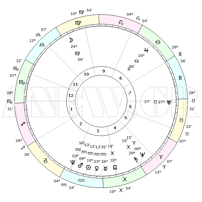 | | ΘΕΣΕΙΣ ΠΛΑΝΗΤΩΝ ΑΣΤΡΟΛΟΓΙΚΟΥ ΧΑΡΤΗ ΤΗΣ ΣΤΙΓΜΗΣ ΑΥΤΗΣ | | | | Πλανήτης | Ζώδιο | Μοίρες | Δεκαήμ. | Σε οίκο | Απόκλιση | | Ακμές των οίκων | | Ηλιος | Υδροχόος | 16°07' | Δεύτερο | 4 | 16 S 00 | | 1ος | 03°20' | Σκορπιός | | Σελήνη | Παρθένος | 23°52' | Τρίτο | 11 | 01 N 12 | | 2ος | 01°58' | Τοξότης | | Ερμής | Υδροχόος | 26°26' | Τρίτο | 4 | 14 S 11 | | 3ος | 04°12' | Αιγόκερως | | Αφροδίτη | Υδροχόος | 23°07' | Τρίτο | 4 | 15 S 09 | | 4ος | 08°37' | Υδροχόος | | Αρης | Υδροχόος | 09°49' | Πρώτο | 4 | 18 S 48 | | 5ος | 11°29' | Ιχθείς | | Δίας | Καρκίνος | 16°56'R | Δεύτερο | 9 | 22 N 40 | | 6ος | 09°50' | Κριός | | Κρόνος | Ιχθείς | 29°09' | Τρίτο | 5 | 02 S 20 | | 7ος | 03°20' | Ταύρος | | Ουρανός | Ταύρος | 27°27' | Τρίτο | 7 | 19 N 24 | | 8ος | 01°58' | Δίδυμοι | | Ποσειδώνας | Κριός | 00°15' | Πρώτο | 5 | 01 S 06 | | 9ος | 04°12' | Καρκίνος | | Πλούτωνας | Υδροχόος | 03°49' | Πρώτο | 3 | 23 S 00 | | 10ος | 08°37' | Λέων | | Β. Δεσμός | Ιχθείς | 10°19' | Δεύτερο | 4 | 07 S 42 | | 11ος | 11°29' | Παρθένος | | Ωροσκόπος | Σκορπιός | 03°20' | Πρώτο | | | 12ος | 09°50' | Ζυγός | | Μεσουράνημα | Λέων | 08°37' | Πρώτο | | | |