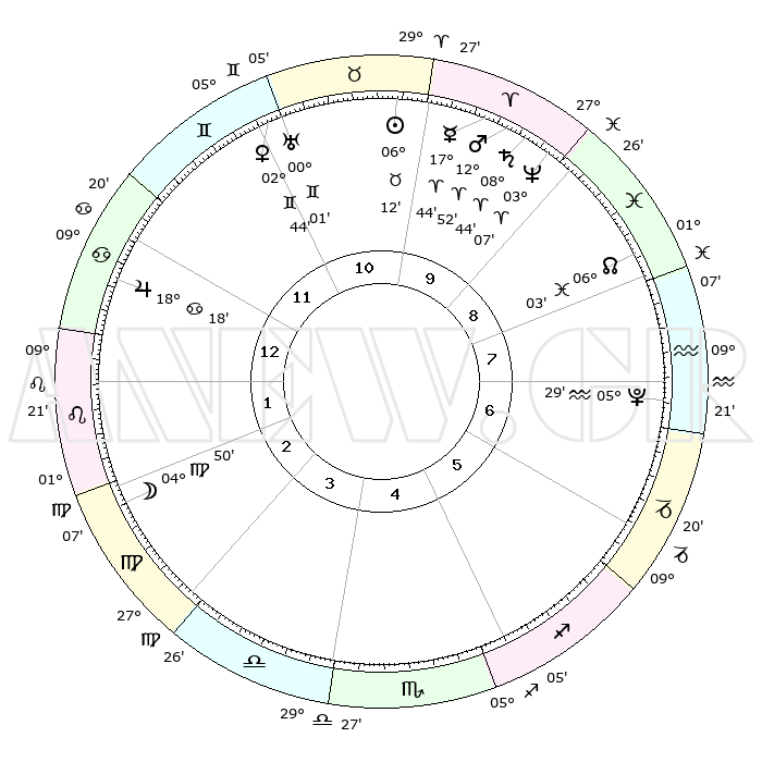 | | ΘΕΣΕΙΣ ΠΛΑΝΗΤΩΝ ΑΣΤΡΟΛΟΓΙΚΟΥ ΧΑΡΤΗ ΤΗΣ ΣΤΙΓΜΗΣ ΑΥΤΗΣ | | | | Πλανήτης | Ζώδιο | Μοίρες | Δεκαήμ. | Σε οίκο | Απόκλιση | | Ακμές των οίκων | | Ηλιος | Ταύρος | 06°08' | Πρώτο | 10 | 13 N 34 | | 1ος | 22°54' | Καρκίνος | | Σελήνη | Παρθένος | 04°06' | Πρώτο | 2 | 10 N 16 | | 2ος | 13°32' | Λέων | | Ερμής | Κριός | 17°38' | Δεύτερο | 10 | 04 N 45 | | 3ος | 07°39' | Παρθένος | | Αφροδίτη | Δίδυμοι | 02°40' | Πρώτο | 11 | 21 N 22 | | 4ος | 07°42' | Ζυγός | | Αρης | Κριός | 12°49' | Δεύτερο | 10 | 04 N 13 | | 5ος | 13°46' | Σκορπιός | | Δίας | Καρκίνος | 18°18' | Δεύτερο | 12 | 22 N 34 | | 6ος | 20°41' | Τοξότης | | Κρόνος | Κριός | 08°44' | Πρώτο | 10 | 01 N 28 | | 7ος | 22°54' | Αιγόκερως | | Ουρανός | Δίδυμοι | 00°01' | Πρώτο | 11 | 19 N 59 | | 8ος | 13°32' | Υδροχόος | | Ποσειδώνας | Κριός | 03°07' | Πρώτο | 9 | 00 N 02 | | 9ος | 07°39' | Ιχθείς | | Πλούτωνας | Υδροχόος | 05°29' | Πρώτο | 7 | 22 S 48 | | 10ος | 07°42' | Κριός | | Β. Δεσμός | Ιχθείς | 06°04' | Πρώτο | 8 | 09 S 17 | | 11ος | 13°46' | Ταύρος | | Ωροσκόπος | Καρκίνος | 22°54' | Τρίτο | | | 12ος | 20°41' | Δίδυμοι | | Μεσουράνημα | Κριός | 07°42' | Πρώτο | | | |