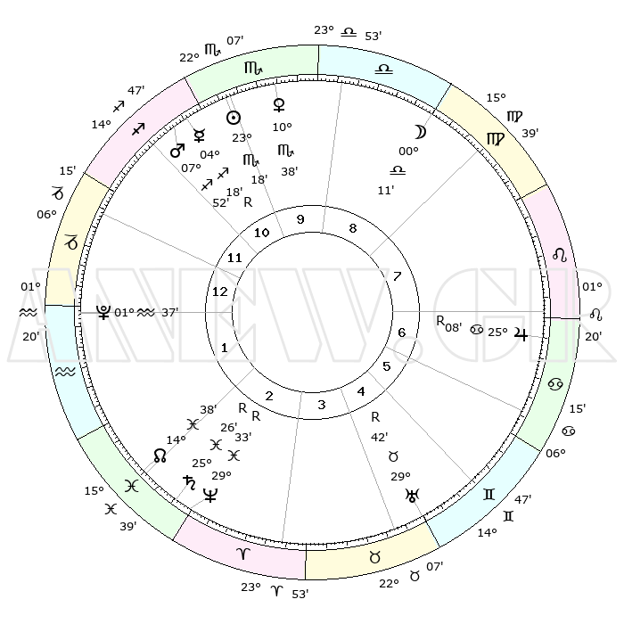 | | ΘΕΣΕΙΣ ΠΛΑΝΗΤΩΝ ΑΣΤΡΟΛΟΓΙΚΟΥ ΧΑΡΤΗ ΤΗΣ ΣΤΙΓΜΗΣ ΑΥΤΗΣ | | | | Πλανήτης | Ζώδιο | Μοίρες | Δεκαήμ. | Σε οίκο | Απόκλιση | | Ακμές των οίκων | | Ηλιος | Σκορπιός | 23°12' | Τρίτο | 11 | 18 S 34 | | 1ος | 28°59' | Τοξότης | | Σελήνη | Παρθένος | 29°07' | Τρίτο | 9 | 00 S 42 | | 2ος | 05°53' | Υδροχόος | | Ερμής | Τοξότης | 04°23'R | Πρώτο | 11 | 22 S 07 | | 3ος | 15°48' | Ιχθείς | | Αφροδίτη | Σκορπιός | 10°32' | Δεύτερο | 10 | 13 S 50 | | 4ος | 19°54' | Κριός | | Αρης | Τοξότης | 07°48' | Πρώτο | 11 | 22 S 07 | | 5ος | 16°23' | Ταύρος | | Δίας | Καρκίνος | 25°08'R | Τρίτο | 7 | 21 N 13 | | 6ος | 08°15' | Δίδυμοι | | Κρόνος | Ιχθείς | 25°26'R | Τρίτο | 3 | 04 S 02 | | 7ος | 28°59' | Δίδυμοι | | Ουρανός | Ταύρος | 29°42'R | Τρίτο | 5 | 19 N 53 | | 8ος | 05°53' | Λέων | | Ποσειδώνας | Ιχθείς | 29°33'R | Τρίτο | 3 | 01 S 26 | | 9ος | 15°48' | Παρθένος | | Πλούτωνας | Υδροχόος | 01°37' | Πρώτο | 1 | 23 S 28 | | 10ος | 19°54' | Ζυγός | | Β. Δεσμός | Ιχθείς | 14°38' | Δεύτερο | 2 | 06 S 03 | | 11ος | 16°23' | Σκορπιός | | Ωροσκόπος | Τοξότης | 28°59' | Τρίτο | | | 12ος | 08°15' | Τοξότης | | Μεσουράνημα | Ζυγός | 19°54' | Δεύτερο | | | |