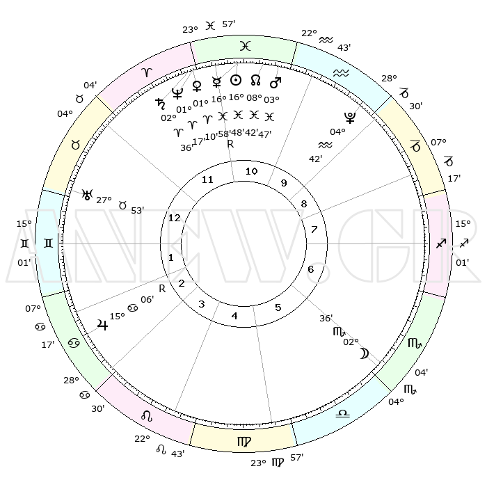 | | ΘΕΣΕΙΣ ΠΛΑΝΗΤΩΝ ΑΣΤΡΟΛΟΓΙΚΟΥ ΧΑΡΤΗ ΤΗΣ ΣΤΙΓΜΗΣ ΑΥΤΗΣ | | | | Πλανήτης | Ζώδιο | Μοίρες | Δεκαήμ. | Σε οίκο | Απόκλιση | | Ακμές των οίκων | | Ηλιος | Ιχθείς | 16°45' | Δεύτερο | 11 | 05 S 14 | | 1ος | 22°10' | Ταύρος | | Σελήνη | Σκορπιός | 01°55' | Πρώτο | 6 | 16 S 05 | | 2ος | 18°41' | Δίδυμοι | | Ερμής | Ιχθείς | 17°01'R | Δεύτερο | 11 | 01 S 46 | | 3ος | 10°27' | Καρκίνος | | Αφροδίτη | Κριός | 01°06' | Πρώτο | 11 | 00 S 42 | | 4ος | 02°43' | Λέων | | Αρης | Ιχθείς | 03°44' | Πρώτο | 11 | 11 S 09 | | 5ος | 29°55' | Λέων | | Δίας | Καρκίνος | 15°07'R | Δεύτερο | 3 | 22 N 56 | | 6ος | 07°01' | Ζυγός | | Κρόνος | Κριός | 02°36' | Πρώτο | 11 | 00 S 55 | | 7ος | 22°10' | Σκορπιός | | Ουρανός | Ταύρος | 27°53' | Τρίτο | 1 | 19 N 31 | | 8ος | 18°41' | Τοξότης | | Ποσειδώνας | Κριός | 01°17' | Πρώτο | 11 | 00 S 41 | | 9ος | 10°27' | Αιγόκερως | | Πλούτωνας | Υδροχόος | 04°42' | Πρώτο | 10 | 22 S 51 | | 10ος | 02°44' | Υδροχόος | | Β. Δεσμός | Ιχθείς | 08°43' | Πρώτο | 11 | 08 S 18 | | 11ος | 29°55' | Υδροχόος | | Ωροσκόπος | Ταύρος | 22°10' | Τρίτο | | | 12ος | 07°01' | Κριός | | Μεσουράνημα | Υδροχόος | 02°44' | Πρώτο | | | |