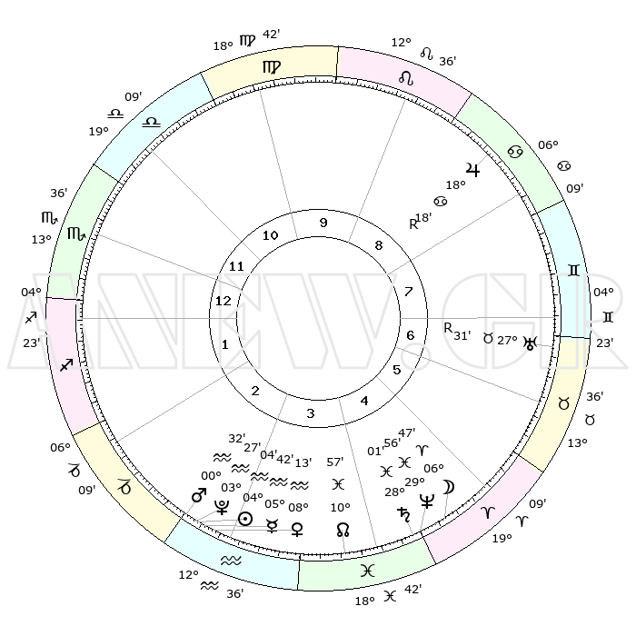 | | ΘΕΣΕΙΣ ΠΛΑΝΗΤΩΝ ΑΣΤΡΟΛΟΓΙΚΟΥ ΧΑΡΤΗ ΤΗΣ ΣΤΙΓΜΗΣ ΑΥΤΗΣ | | | | Πλανήτης | Ζώδιο | Μοίρες | Δεκαήμ. | Σε οίκο | Απόκλιση | | Ακμές των οίκων | | Ηλιος | Υδροχόος | 03°59' | Πρώτο | 3 | 19 S 15 | | 1ος | 11°09' | Σκορπιός | | Σελήνη | Κριός | 05°42' | Πρώτο | 5 | 04 N 23 | | 2ος | 10°19' | Τοξότης | | Ερμής | Υδροχόος | 05°34' | Πρώτο | 3 | 20 S 54 | | 3ος | 13°21' | Αιγόκερως | | Αφροδίτη | Υδροχόος | 08°07' | Πρώτο | 3 | 19 S 24 | | 4ος | 18°20' | Υδροχόος | | Αρης | Υδροχόος | 00°29' | Πρώτο | 3 | 21 S 02 | | 5ος | 20°58' | Ιχθείς | | Δίας | Καρκίνος | 18°18'R | Δεύτερο | 9 | 22 N 28 | | 6ος | 18°28' | Κριός | | Κρόνος | Ιχθείς | 28°00' | Τρίτο | 5 | 02 S 48 | | 7ος | 11°09' | Ταύρος | | Ουρανός | Ταύρος | 27°31'R | Τρίτο | 7 | 19 N 25 | | 8ος | 10°19' | Δίδυμοι | | Ποσειδώνας | Ιχθείς | 29°56' | Τρίτο | 5 | 01 S 14 | | 9ος | 13°21' | Καρκίνος | | Πλούτωνας | Υδροχόος | 03°27' | Πρώτο | 3 | 23 S 04 | | 10ος | 18°20' | Λέων | | Β. Δεσμός | Ιχθείς | 10°57' | Δεύτερο | 4 | 07 S 27 | | 11ος | 20°58' | Παρθένος | | Ωροσκόπος | Σκορπιός | 11°09' | Δεύτερο | | | 12ος | 18°28' | Ζυγός | | Μεσουράνημα | Λέων | 18°20' | Δεύτερο | | | |